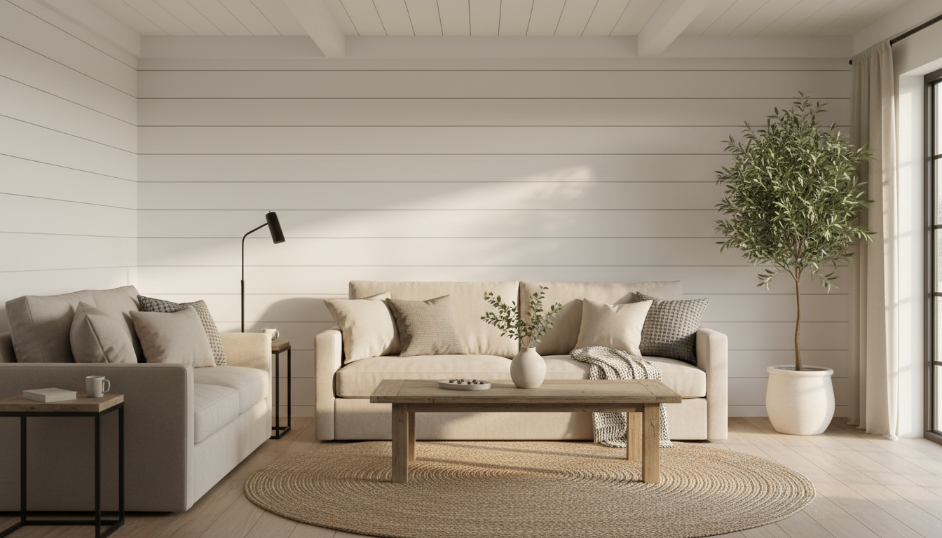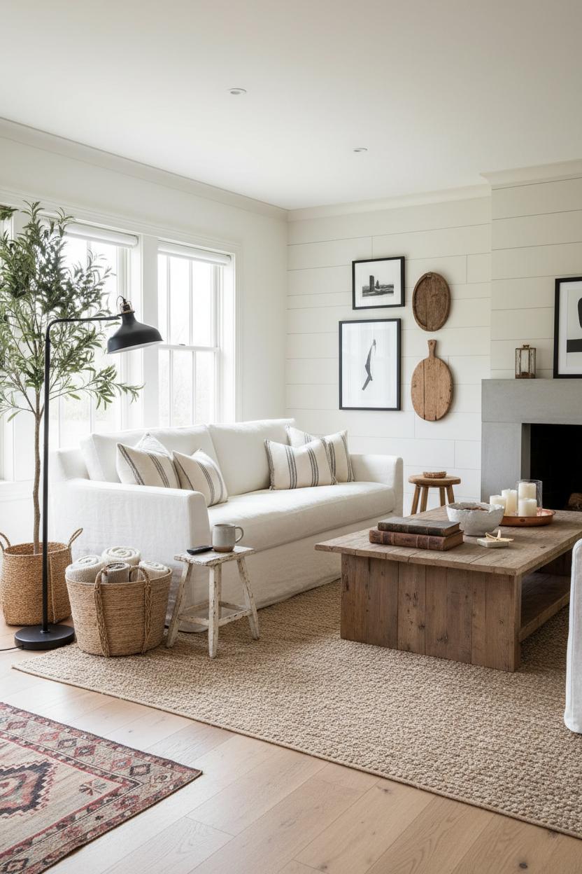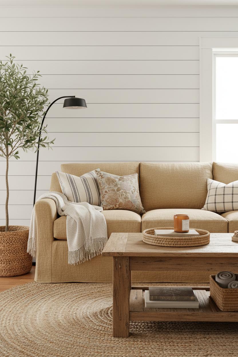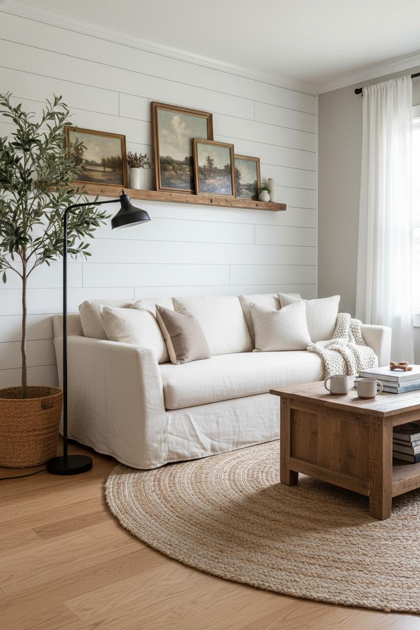 Once the planks are up, layer in pieces that balance rustic soul with clean lines for that perfect modern farmhouse mix. A linen slipcover sofa instantly softens the room and invites lounging, while a jute area rug grounds the space with nubby, natural texture. Add a reclaimed wood coffee table for a timeworn touch that plays beautifully against the crisp lines of the shiplap wall. For contrast, a black metal floor lamp brings a hint of industrial edge and a cozy, book-at-dusk glow. Tuck a faux olive tree into a woven basket to add height, greenery, and that lived-in, collected vibe without the maintenance. Style a long shelf or simple art ledge on the wall with layered frames, vintage-inspired landscapes, and a few ceramics; the linear backdrop makes even casual styling look intentional. Whether your style leans rustic living room or you prefer a sleeker take on modern farmhouse decor, shiplap is the versatile foundation that ties it all together—one of those cozy living room ideas that feels classic on day one and only gets better as you make the space your own.