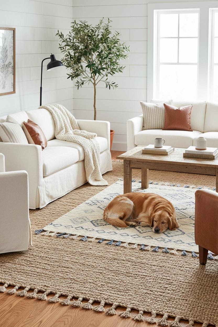 If your seating feels like it’s floating, a textured jute area rug is the instant, earth‑toned anchor your farmhouse living room is craving. The sandy weave adds that sun‑washed, beach‑meets‑barn vibe that modern farmhouse decor does so well—elevated but unfussy, fresh yet a little rugged. I love how the nubby texture plays against smoother elements in the room: think a relaxed linen slipcover sofa, a timeworn reclaimed wood coffee table, and a crisp shiplap wall as the backdrop. Jute’s organic fibers bring a warm, golden base that makes everything layered on top—pillows, throws, and your favorite dog—look intentional and cozy without trying too hard. Bonus: it’s durable, forgiving, and the variegated tones are amazing at camouflaging everyday life.