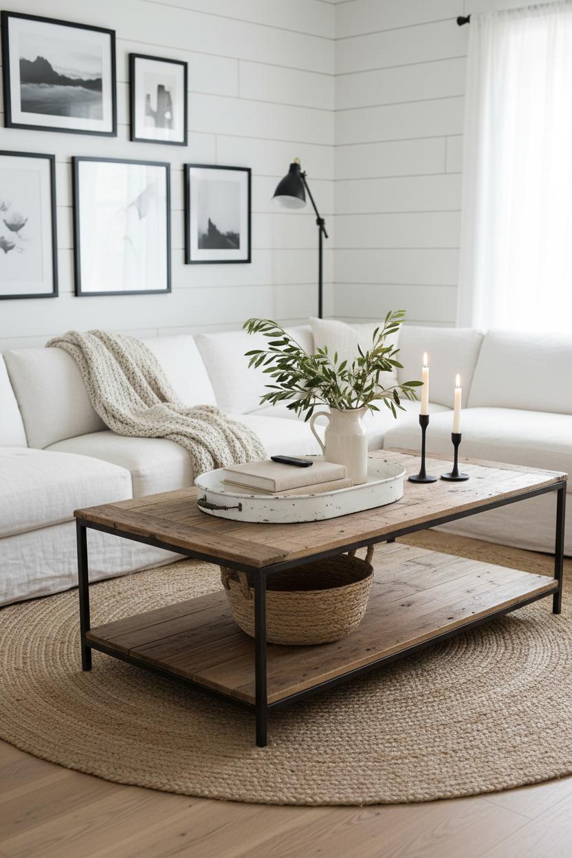 Style it like a pro by treating the surface as a mini vignette: an oversized tray to corral essentials, a ceramic pitcher with fresh stems or a petite faux olive tree for life and movement, and a couple of candles for that golden-hour glow. Let contrast keep things crisp—a black metal floor lamp beside the sofa echoes dark picture frames or cabinet hardware and gives the eye a resting point amid all the cozy textures. Keep your palette simple and soothing—creamy whites, soft grays, inky black, and weathered wood—then layer in tactile moments: linen, jute, seagrass, and a knit throw tossed across the cushions. Consider shape and scale, too. In a tighter seating area, a round table keeps traffic flowing; in a larger layout, a long rectangular piece bridges multiple seats without feeling heavy. For truly cozy living room ideas, think function baked into beauty: hidden casters for easy movement, a lower shelf for baskets, and styling that can shift with the seasons—spring buds, summer shells, autumn branches, winter greenery. With a soulful centerpiece like this, the rest of your modern farmhouse decor falls into place, creating a space that feels welcoming from the first step in.