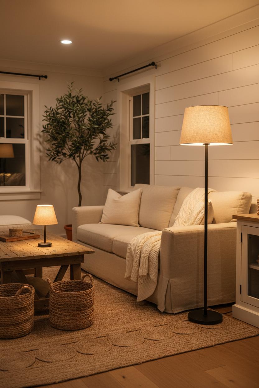 When the sun dips and golden hour fades, the right lamp turns your farmhouse living room from pretty to downright irresistible. A slim black metal floor lamp brings that subtle, sculptural line modern farmhouse decor loves, while its matte finish keeps things grounded and not too glossy. Park it next to a linen slipcover sofa so the light glows through the fabric and softens the whole seating area; the texture of linen makes the beam feel buttery instead of harsh. Let it stand against a shiplap wall so the silhouette pops and the boards catch the light—instant depth without trying. Choose a drum or tapered linen shade and a warm 2700–3000K bulb; it’s the secret to candlelike ambiance that flatters skin tones and wood grains alike.