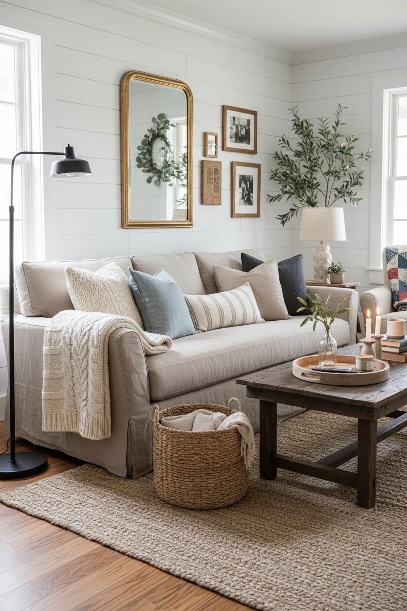 When you’re putting the final, heartwarming layer on a farmhouse living room, think in terms of texture, tone, and touch. Start with pillows that feel collected, not coordinated: a mix of chunky knits, soft washed linen, and subtle ticking stripes instantly makes a linen slipcover sofa look effortless and inviting. Vary sizes—oversized squares for lounging, a long lumbar for support—and play with quiet neutrals punctuated by one or two grounding hues pulled from your art or rug. Drape a cable-knit throw over the arm and fold a lighter linen one in a basket for warm days that still call for a little coziness. Underfoot, a jute area rug adds that natural, nubby layer that’s equal parts durable and down-to-earth, especially when it’s paired with the warm patina of a reclaimed wood coffee table. If you’ve got a shiplap wall, let it be your backdrop for a curated moment—an antique mirror, a simple wreath, or a stack of vintage frames—so the whole scene reads relaxed and beautifully lived-in.