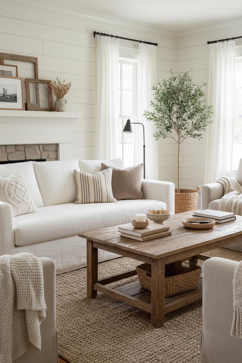 Start with the bones and build the mood from there: a soft, neutral palette instantly makes a farmhouse living room feel airy and relaxed, and it’s the perfect backdrop for layers of texture. If your walls need a quick lift, a simple shiplap wall—whether behind the sofa or framing the fireplace—adds subtle character without overwhelming the room. Keep window treatments breezy with linen panels so natural light spills in, then tuck a faux olive tree into a woven basket for an easy hit of height and greenery that looks timeless through every season.
