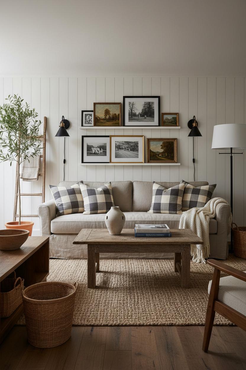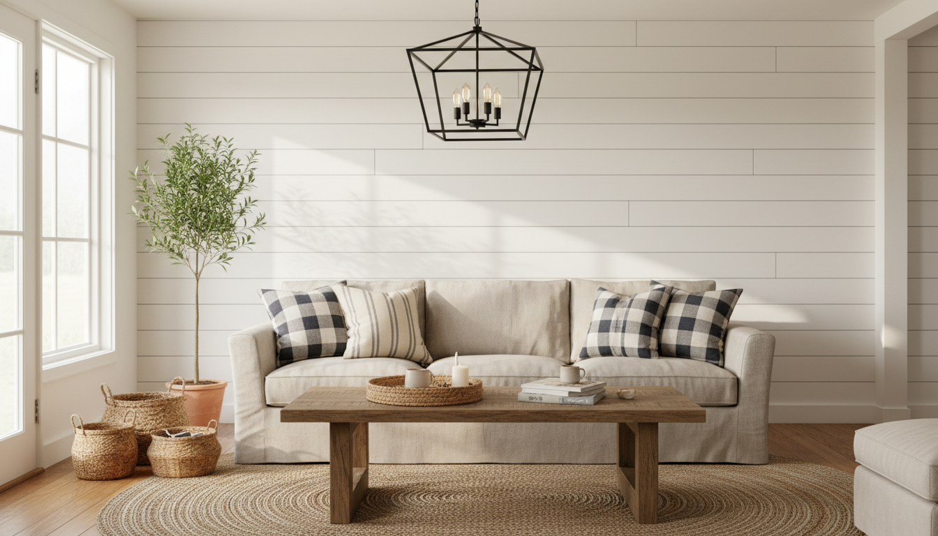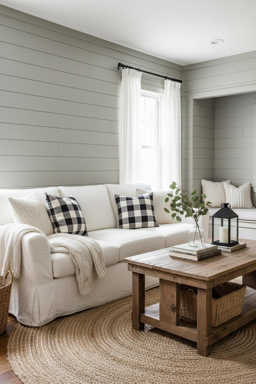 Once the wall is up, let the styling do the talking. I love placing it behind a linen slipcover sofa so the neutral texture of the “planks” frames your seating like a cozy backdrop. Layer in buffalo check pillows with nubby throws for that soft, lived-in pattern mix, then ground the scene with a jute area rug for natural fiber warmth underfoot. A well-worn rustic coffee table brings in wood tones that echo the “shiplap,” while matte black lanterns or iron curtain rods add that hint of contrast modern farmhouse decor is known for. Keep accessories easy and organic—woven baskets, a stack of vintage books, and a simple vase of eucalyptus—so the wall’s quiet texture shines. The look is tailored yet relaxed, a sweet spot for neutral home decor where every element plays nicely together.