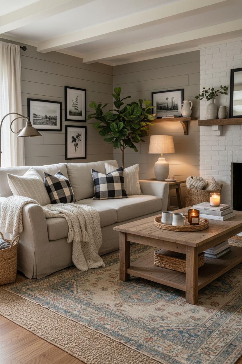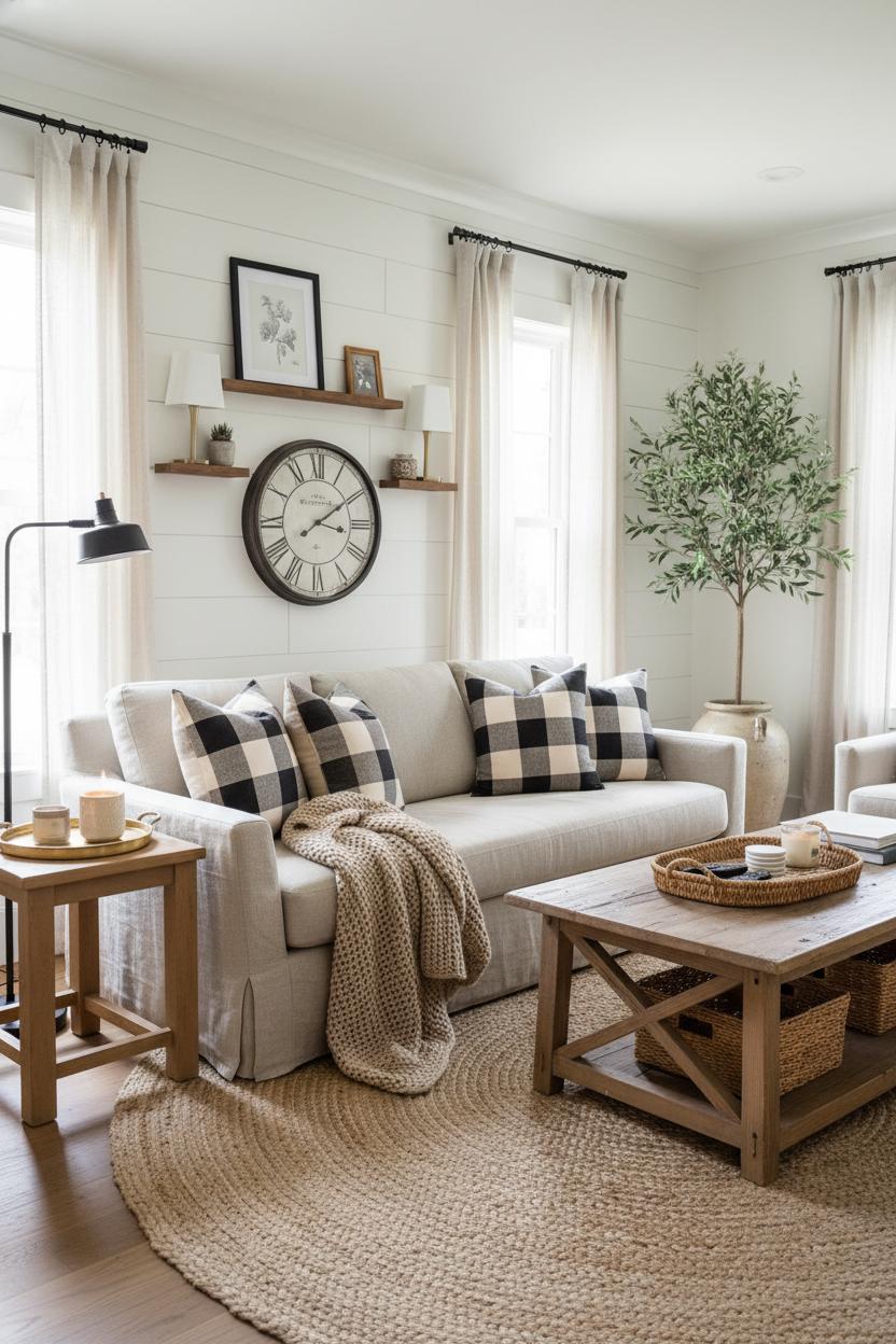 Begin with a soft, layered foundation that makes your farmhouse living room feel calm the moment you walk in. Think neutral home decor with creamy whites, warm beiges, and soft grays that let textures do the talking. A linen slipcover sofa instantly brings that relaxed, sink-in comfort while still looking tailored, especially when it’s piled with buffalo check pillows for a touch of classic country charm. Ground the seating area with a chunky jute area rug to add natural texture underfoot, then balance it with a rustic coffee table—weathered wood or reclaimed beams are perfect—to introduce an earthy, collected vibe. Mix metals and woods for depth: a matte black floor lamp, a brass tray, and a warm oak side table keep things feeling curated, not matchy. This is modern farmhouse decor at its best—casual, welcoming, and just a little bit refined—so your rustic living room reads cozy yet current.