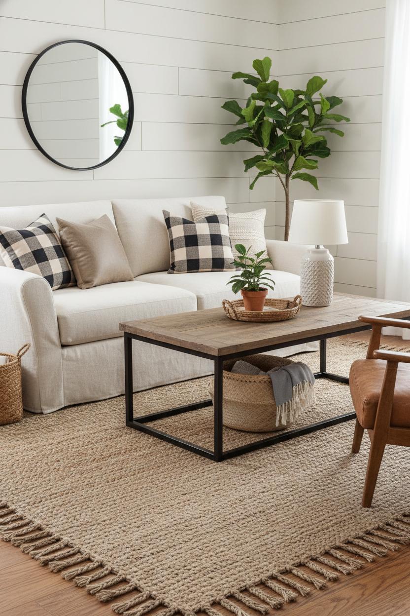 Nothing cozies up a farmhouse living room quite like the earthy texture of a jute area rug. That chunky weave brings instant warmth and a laid-back, barefoot charm that grounds the whole space. Imagine it under a linen slipcover sofa with a rustic coffee table layered on top—suddenly your seating zone feels intentional, inviting, and beautifully cohesive. Because jute skews warm and sandy, it plays so well with neutral home decor: creamy walls, soft taupes, warm woods, and touches of matte black. Add buffalo check pillows for a whisper of pattern and that classic country nod, and you’ve got a look that straddles modern farmhouse decor and a cozy rustic living room in the best way. If you’re dreaming up shiplap ideas for the walls, the organic weave of jute softens all those clean lines, and if you’re renting, shiplap peel and stick wallpaper is a great shortcut to get the same layered look without a long-term commitment.