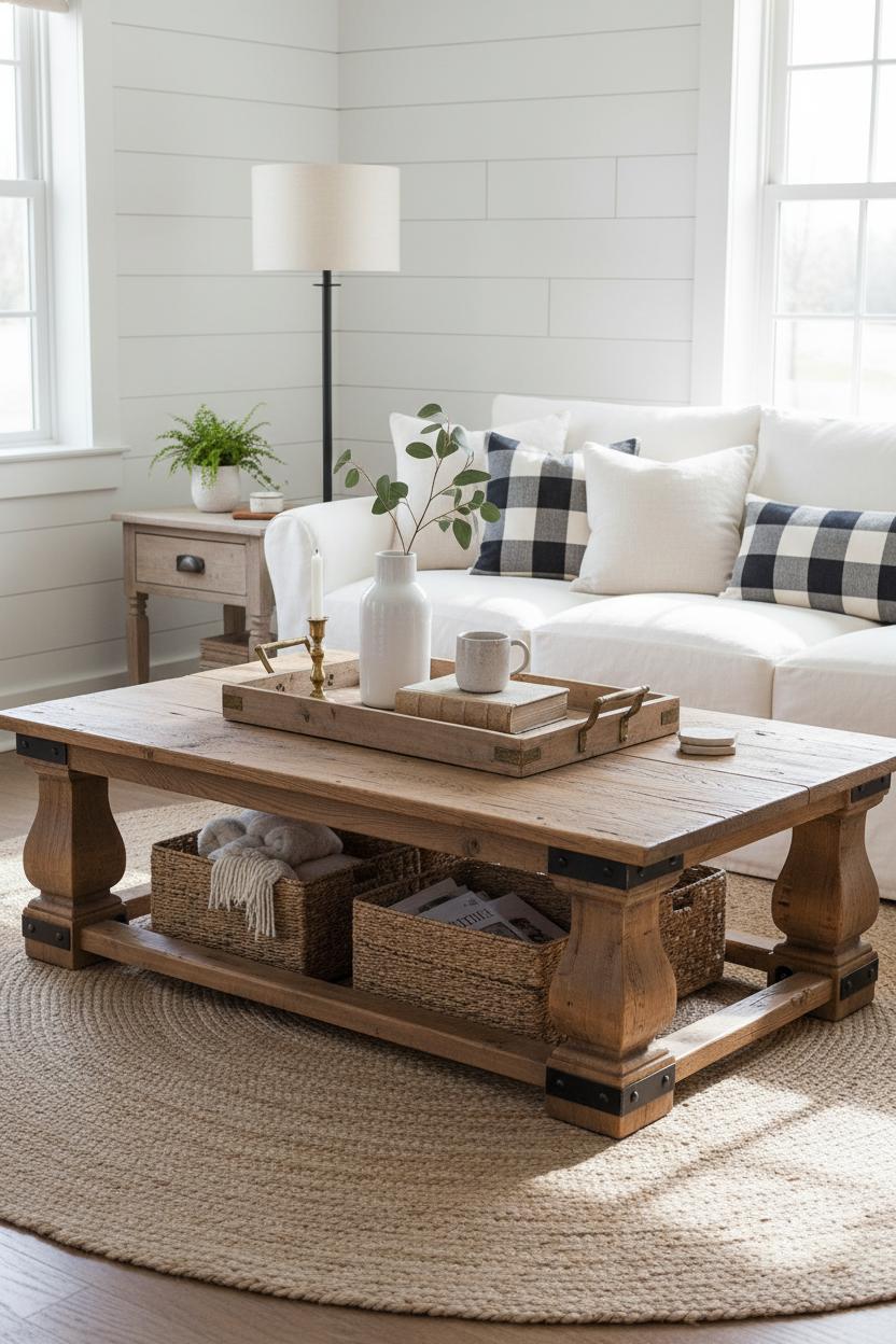 Nothing grounds a cozy farmhouse living room quite like a rustic coffee table that mixes soul and storage. Opt for reclaimed wood or a weathered oak finish—think chunky turned legs or a blackened metal base for a wink of industrial within modern farmhouse decor. A lift-top or drawers are game changers: stash remotes, coasters, and the endless board-game stack so the surface stays serene for a candle, a simple greenery stem, and your favorite mug. If you have littles, consider a softly rounded top; if you entertain, casters make it easy to float the table where you need it. Nest a pair of low woven baskets beneath for blankets and magazines, and suddenly the high-traffic heart of your rustic living room feels both easy and intentionally layered. As a rule of thumb, choose a table about two-thirds the length of your sofa and roughly the same height as the seat (or an inch lower) so snacks and laptops land within easy reach. Open shelves keep favorite throws visible; closed drawers hide the rest for that calm, clutter-free vibe we all crave at the end of a busy day.