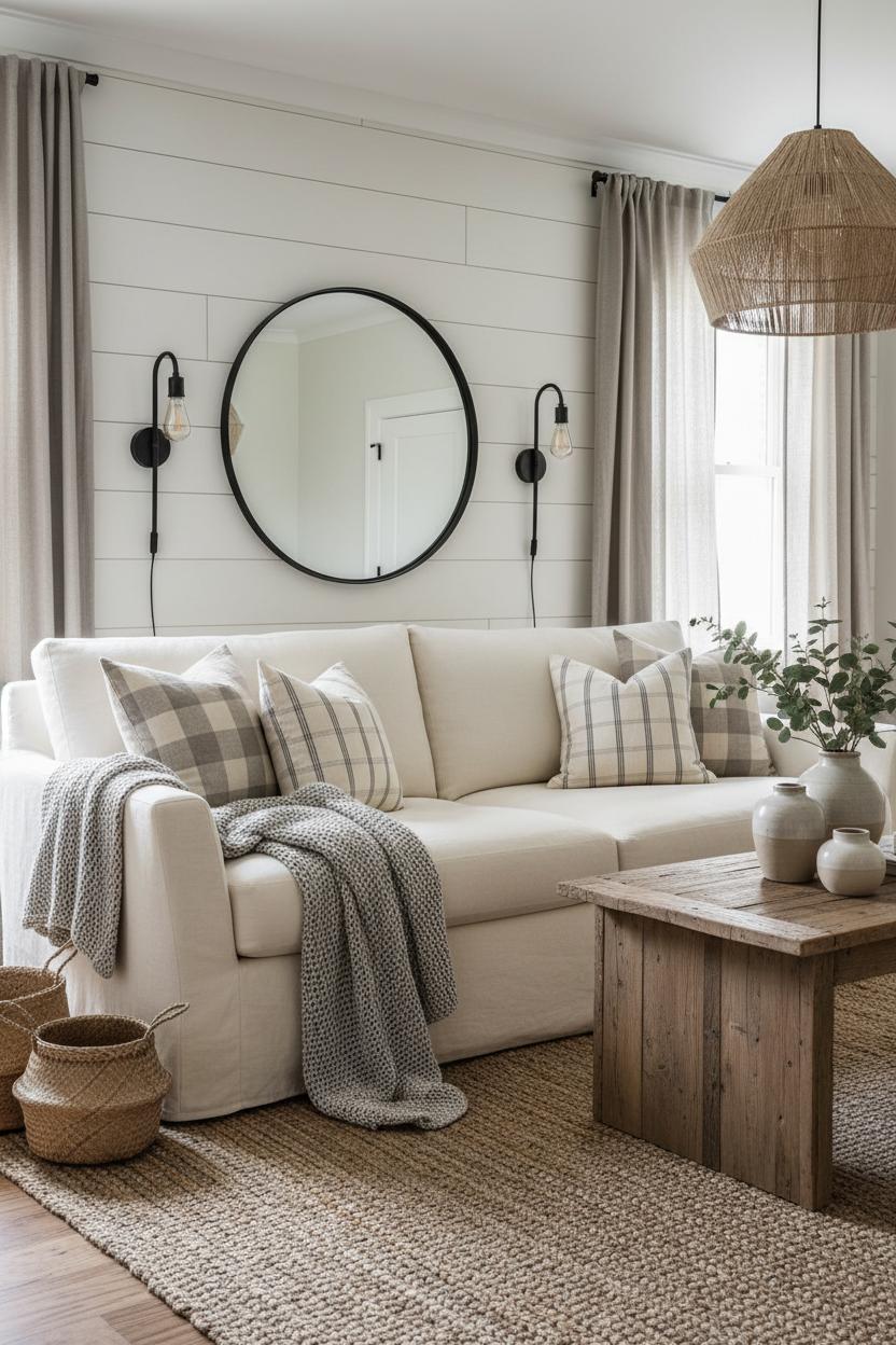 Start with a plush linen slipcover sofa in warm ivory as your anchor—effortless, washable, and perfect for everyday lounging. Underfoot, a chunky jute area rug adds earthy texture and defines the seating area, while a rustic coffee table in reclaimed wood brings in quiet character and a soft, timeworn finish. For pattern that still reads neutral, try buffalo check pillows in oatmeal and gray, then mix in a couple of ticking stripes to keep things playful. If your walls need character, explore shiplap ideas without the commitment: shiplap peel and stick wallpaper is a renter-friendly shortcut that gives you instant cottage charm and a beautiful backdrop for layered art or a simple round mirror. Add depth with baskets, stoneware, and linen drapery in varied shades of cream and greige; tuck eucalyptus stems into a pottery jug; and use iron sconces or a woven pendant to warm up the palette with moody light. The result is a room that feels soft, inviting, and endlessly adaptable—proof that a restrained palette can be incredibly rich when you let texture, patina, and quiet color shifts do the heavy lifting in your farmhouse living room.
