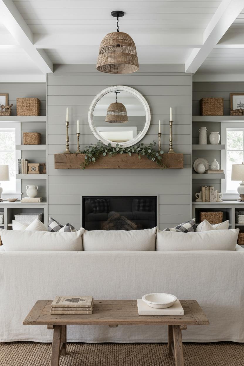 Shiplap doesn’t have to stop at the walls—some of the coziest farmhouse living room moments happen when you stretch those soft lines across mantels, ceilings, and built-ins. Try wrapping the face of your mantel in slim horizontal boards, painted a warm white or soft greige to blend with neutral home decor. It instantly frames the fireplace, giving your art, mirror, or TV a tailored backdrop that still feels relaxed. If your brick or stone needs a style bridge, a shiplap overmantel panel adds just enough modern farmhouse decor polish without stealing the rustic soul. Layer in a chunky wood beam, a strand of greenery, and a pair of vintage candlesticks, then echo the pattern with a few buffalo check pillows on your linen slipcover sofa for a pin-worthy hearth scene.