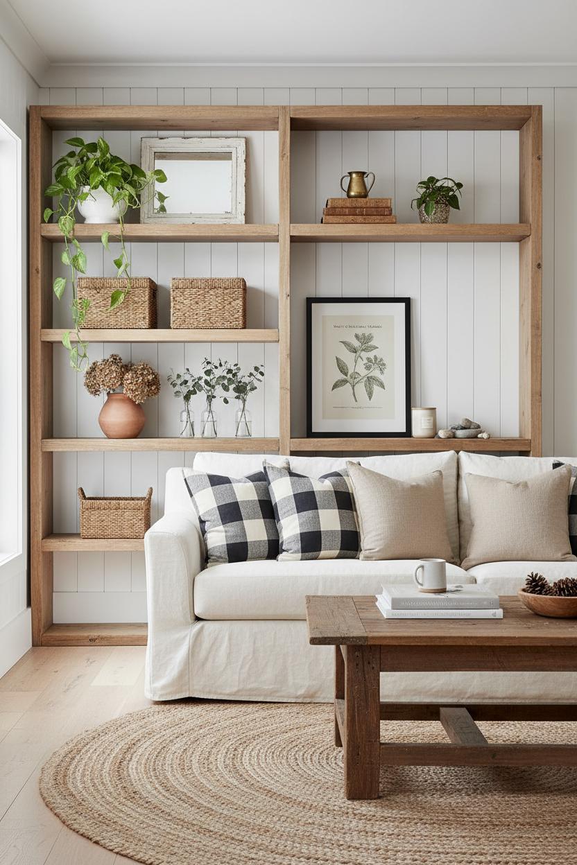 Open shelving is where your farmhouse living room gets to tell its story. Think of those shelves as a curated mantel that shifts with the seasons: woven baskets for warmth and storage, airy botanicals for life, and a sprinkling of vintage finds for soul. Start by setting the stage with a soft, textural backdrop—this is where simple shiplap ideas shine. If you’re not ready for nails and boards, shiplap peel and stick wallpaper brings that cozy cottage stripe without the commitment. Keep your palette rooted in neutral home decor—creamy whites, oatmeals, and weathered woods—so the eye can rest. Nearby, a linen slipcover sofa layered with buffalo check pillows feels relaxed and welcoming, while a jute area rug under a rustic coffee table grounds the whole scene in natural texture. The mix of old and new is what creates that effortless modern farmhouse decor vibe: clean lines meet timeworn finishes, greenery softens metal, and baskets corral the everyday into something pretty.
