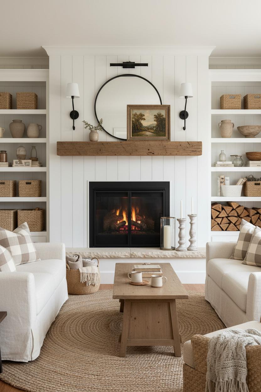 Style the mantel with restraint so the room reads as modern farmhouse decor, not overly themed. Lean a vintage landscape against a round mirror, add a couple of weathered books, and tuck in greenery for life and movement. Then build out the seating for conversation: a linen slipcover sofa facing the flames, a rustic coffee table for cocoa mugs, and a jute area rug to ground all that beautiful texture. Keep to a palette of neutral home decor—creamy whites, soft taupes, honeyed woods—then weave in gentle pattern with buffalo check pillows for a wink of farmhouse charm. If you have built-ins flanking the fireplace, style them with pottery, woven bins, and a stack of split logs so storage becomes part of the story.