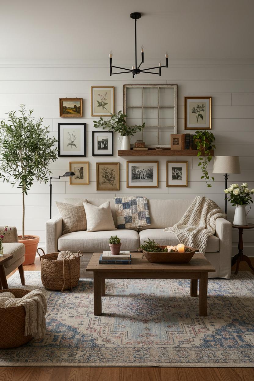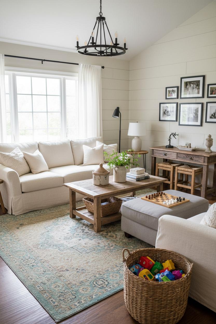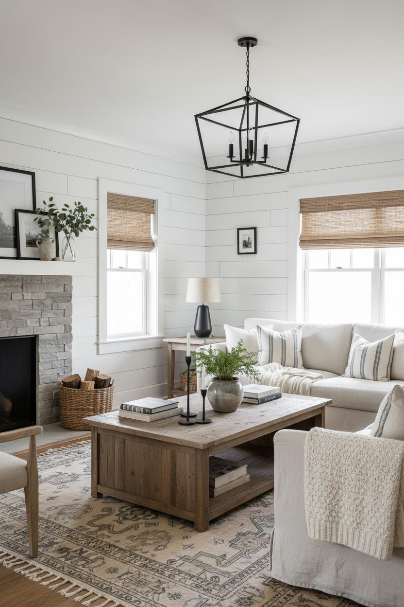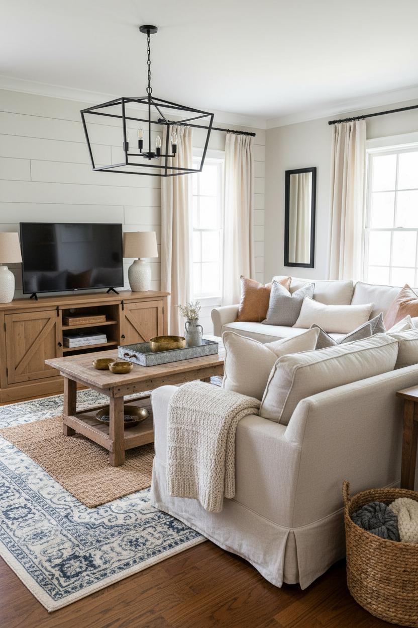 Layers bring the coziness. Start with a cozy neutral palette—creamy whites, oatmeal, soft gray—and then build dimension with nubby throws, chunky knit pillows, and woven baskets for remotes and blankets. Define the seating area by laying a larger natural-fiber rug and topping it with a vintage style area rug for color and pattern that still reads calm. If your walls need texture, a simple shiplap wall design adds instant farmhouse charm; renters can cheat it with shiplap peel and stick for the same look without the commitment. Keep side tables within easy reach of every seat, and vary heights with a floor lamp by the reading chair, a petite table lamp near the sofa, and a statement black metal chandelier overhead to pull the whole room together.