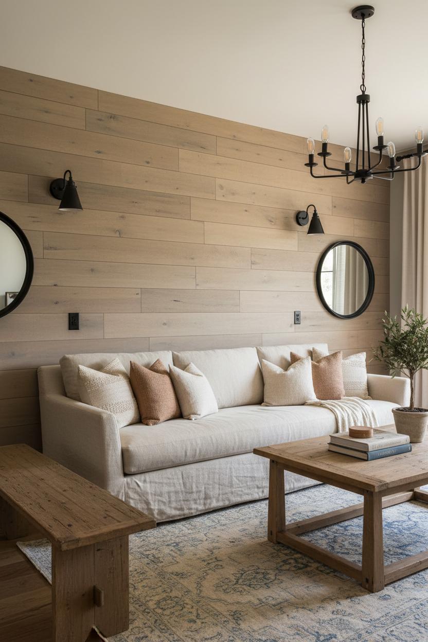 When you’re dreaming up a cozy neutral palette that still feels rich and dimensional, start with wood as your grounding layer. Mix tones intentionally—think a warm oak media console paired with a reclaimed wood coffee table that brings a little age and patina to the party. If your walls feel flat, a simple shiplap wall design adds instant texture; renters can even try shiplap peel and stick to get that charming farmhouse stripe without the commitment. Balance those natural woods with soft edges, like a linen slipcover sofa that invites sprawling Sunday naps, and let the grain and fabric weave become the quiet stars. This is the heart of a farm style living room: unfussy, tactile, and beautifully lived-in.