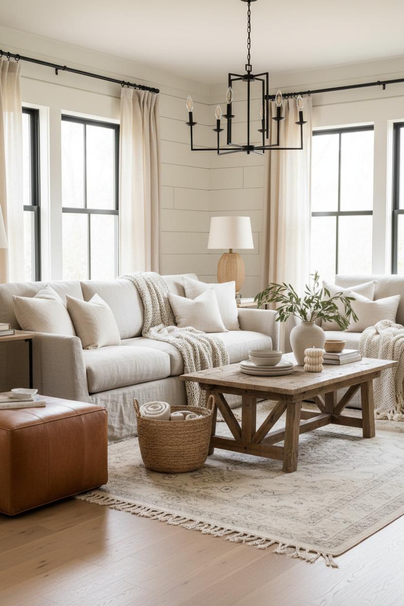 Once the big pieces are in place, it’s the little layers that make a farm style living room feel truly lived-in. Start with greenery—always. A potted olive tree in the corner softens the room’s angles, while eucalyptus stems in a stoneware crock add texture to a mantel or sideboard. Trail a pothos from a basket on a shelf, or tuck wildflower clippings into old mason jars for a just-picked feel. These organic touches play beautifully against a cozy neutral palette, letting your textures do the talking: nubby knits over a linen slipcover sofa, a chunky throw tossed casually across the arm, and woven baskets warming up the floor. Ground the space with a vintage style area rug that whispers of timeworn pattern beneath a reclaimed wood coffee table styled with a stack of well-loved books and a small terracotta pot. Overhead, a black metal chandelier adds that perfect hit of contrast—sleek yet simple—so the whole mix reads as modern farmhouse decor rather than overly rustic. Think of these as effortless rustic living room ideas that invite people to linger.