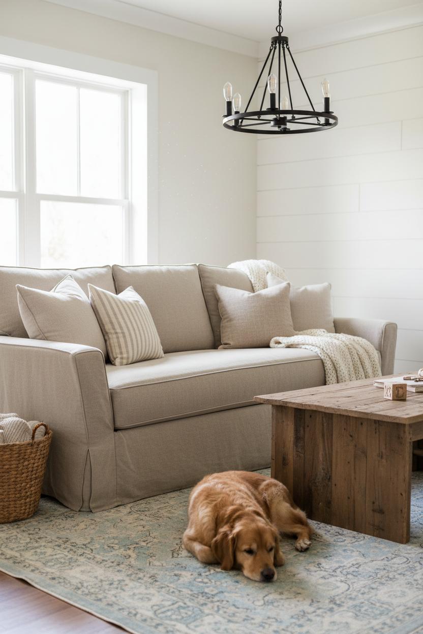 Once your seating is set, layer in texture and timeworn charm to complete the scene. A reclaimed wood coffee table adds rugged contrast against the softness of linen, while a vintage style area rug grounds the room with pattern and patina. Overhead, a black metal chandelier brings in just the right bit of graphic edge. If you’re dreaming of a shiplap wall design but want a renter-friendly route, try shiplap peel and stick for instant character sans sawdust. These rustic living room ideas all sing in harmony when you keep the palette restful and the materials tactile—think nubby throws, ticking-stripe pillows, and a basket for cozy throws tucked beside the sofa’s skirt. For care, shake out crumbs, rotate cushions monthly, and launder covers on cold with gentle detergent; air-dry and slip them back on slightly damp to smooth wrinkles. Pets, kids, movie nights—the beauty of a linen slipcover sofa is that it welcomes it all, aging gracefully and letting you swap covers seasonally so your space always feels fresh, lived-in, and unfussy.