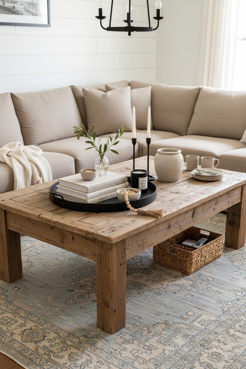 Think of your reclaimed wood coffee table as the storyteller in your space—the one piece that quietly grounds the room while showing off all the layered personality your cozy neutral palette has to offer. I like to start by centering the table on a vintage style area rug so the weathered boards meet something soft and pattern-rich beneath them; it instantly feels collected and intentional. Then, bring in a low, oversized tray to corral the pretty-and-practical: a stack of well-loved design books, a petite vase of clipped greenery, a candle in warm brass or matte black, and a small bowl for matches. The contrast of rough grain against smooth ceramic and glass is what makes modern farmhouse decor feel elevated yet unfussy. If you’ve got a linen slipcover sofa across from the table, even better—the relaxed drape and nubby weave play beautifully with the table’s knots and saw marks, creating that easy, farm style living room vibe without trying too hard.