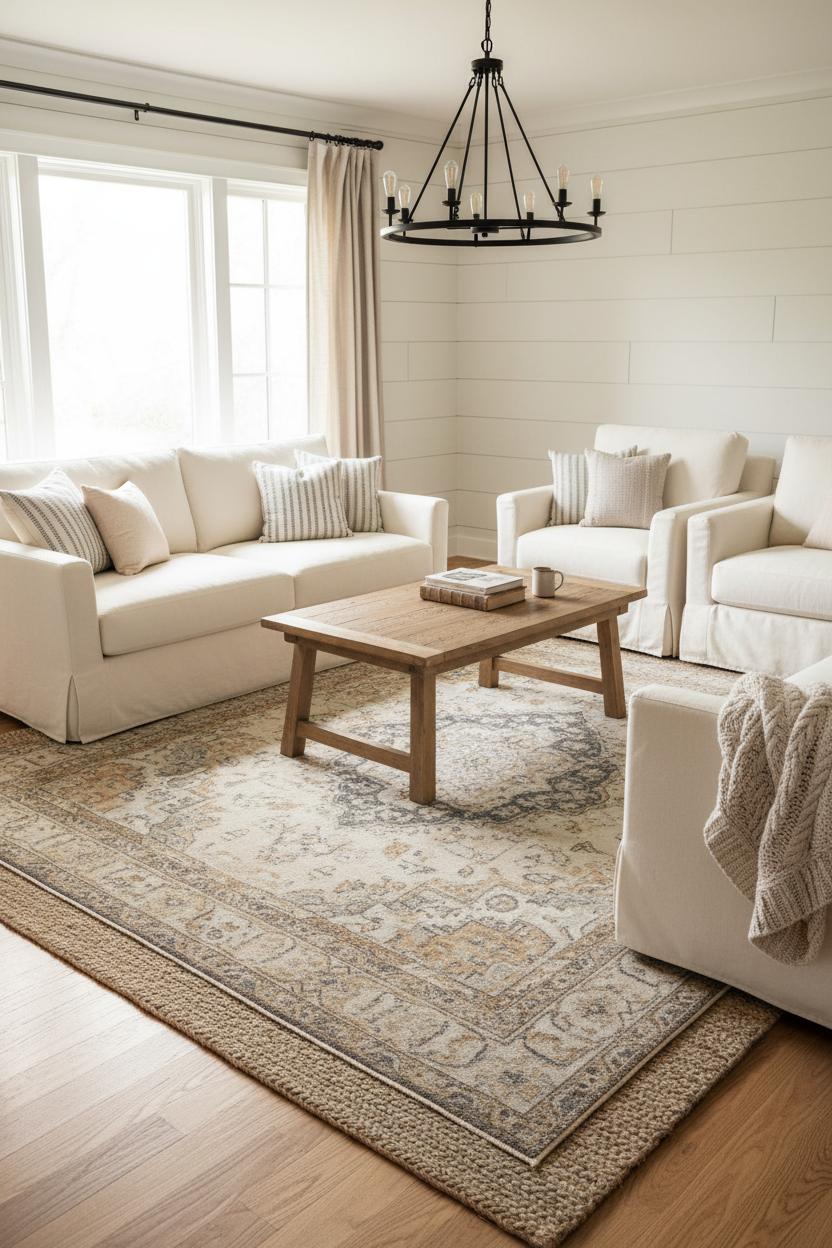 When you’re building a cozy farmhouse living room with rustic charm from the floor up, start with a vintage style area rug that looks like it already has a beautiful life behind it. That soft, timeworn patina is what instantly grounds the room, connects furniture pieces, and adds story underfoot. Look for a low-pile rug with a gently faded pattern—think antique-inspired florals or a subtle medallion—that echoes the cozy neutral palette you love: oatmeal, sand, warm gray, and a whisper of charcoal. Those tones will cozy up to a linen slipcover sofa and a reclaimed wood coffee table without competing, while the delicate distressing hides life’s little messes. In a farm style living room, the rug is the bridge between texture and tone, so choose one that plays nicely with your shiplap wall design (or renter-friendly shiplap peel and stick) and draws the eye down from a striking black metal chandelier overhead.