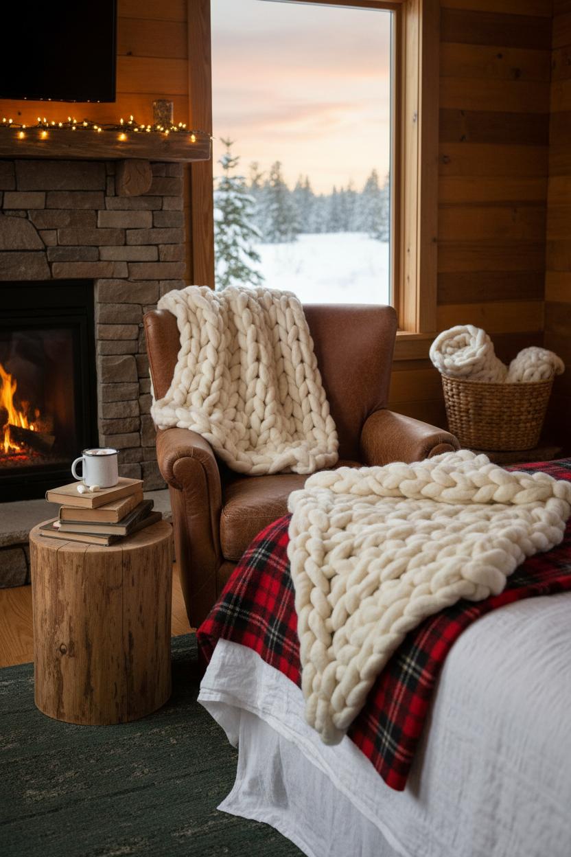 If you pack just one thing to set the mood, make it a chunky knit throw. It’s the quickest way to bring hygge decor to life, turning woodsy corners and leather sofas into soft, sink-in nooks. Drape one casually over the arm of a chair or fold it at the foot of the bed so those cloud-like stitches are the first thing you see when you step in from the cold. Layering is everything in rustic cabin style: think creamy neutrals, a hint of charcoal or forest green, and materials that feel like a warm exhale—wool, linen, and raw wood. The throw’s oversized texture breaks up straight cabin lines and instantly invites lingering with a book and cocoa. Add a plaid wool blanket for pattern and a little lodge charm, and you’ve got cozy getaway inspo without overthinking it. Keep the palette simple, the textiles touchable, and let the view do the rest.