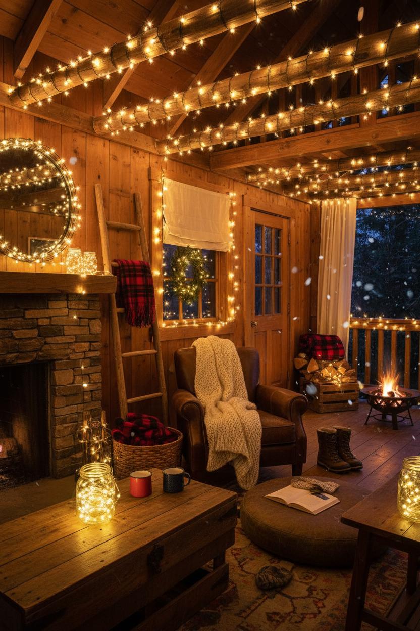 For easy cabin retreat ideas, pair the lights with texture and ritual. Toss a chunky knit throw over the arm of a leather chair, stack a plaid wool blanket in a basket by the hearth, and set out enamel camp mugs ready for cocoa. Drape battery string lights across a wreath or along stacked firewood for rustic cabin style without fuss, then create a reading nook with a floor cushion, soft socks, and your favorite book. The lights soften edges and blur shadows, making small spaces feel cocooned—which is exactly the cozy getaway inspo we crave when the temps drop. If your cabin is drafty, twining a strand behind sheer curtains adds a gentle backlight that feels warm even when the air is crisp.
