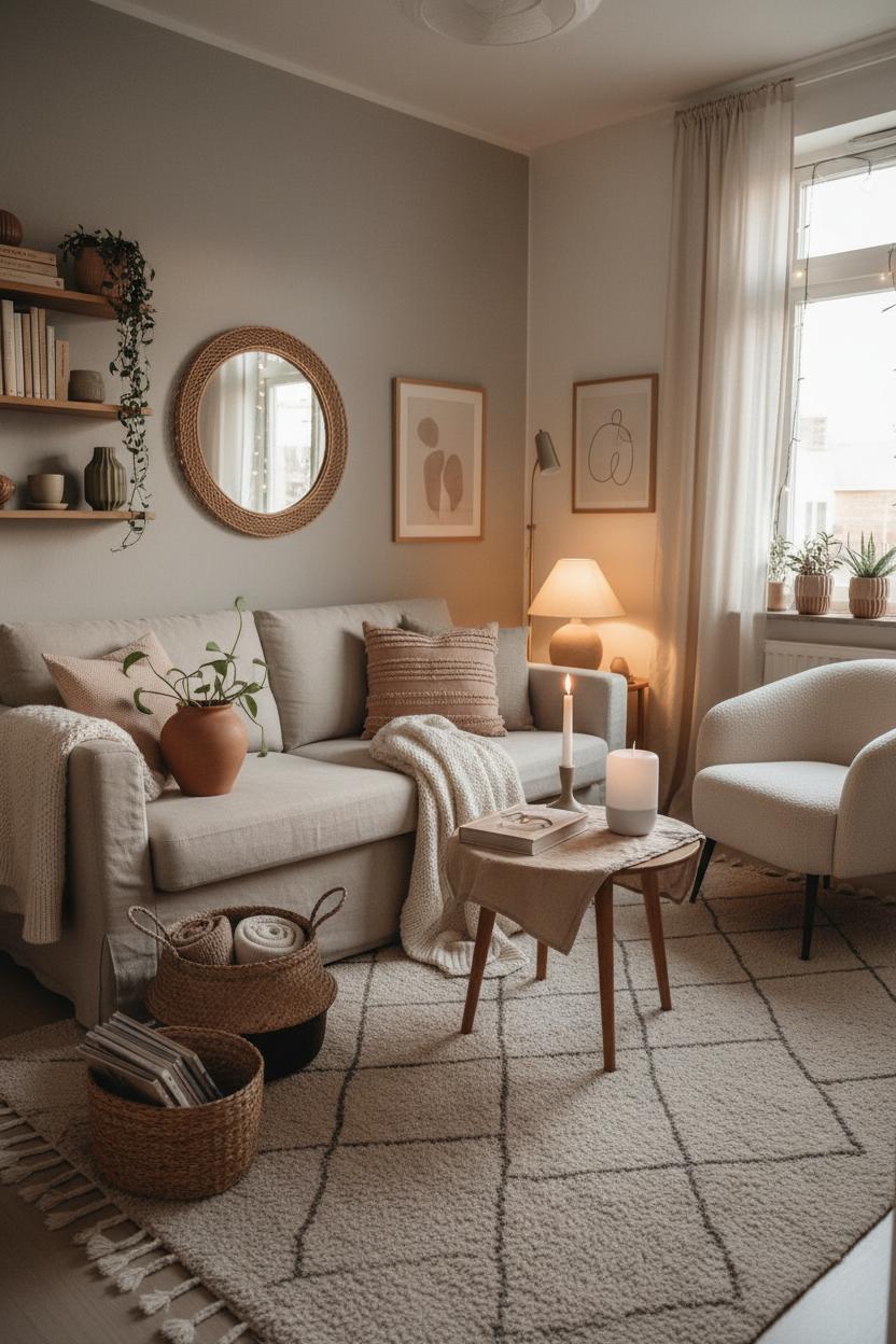 When space is tight, think in zones and layers rather than square feet. Start by carving out defined mini-areas—a welcome mat moment by the door, a reading perch by the window, a petite dining nook—so your home feels intentional instead of crowded. A neutral area rug can quietly anchor each spot and make the room look larger, while airy, leggy furniture keeps sightlines open. Mirrors bounce light and stretch walls visually, and a couple of ceramic planters add life without adding bulk; choose trailing greens on floating shelves to draw the eye upward. These apartment decorating ideas thrive on small space living magic: repeat a soft color palette, edit surfaces, and let texture do the talking.