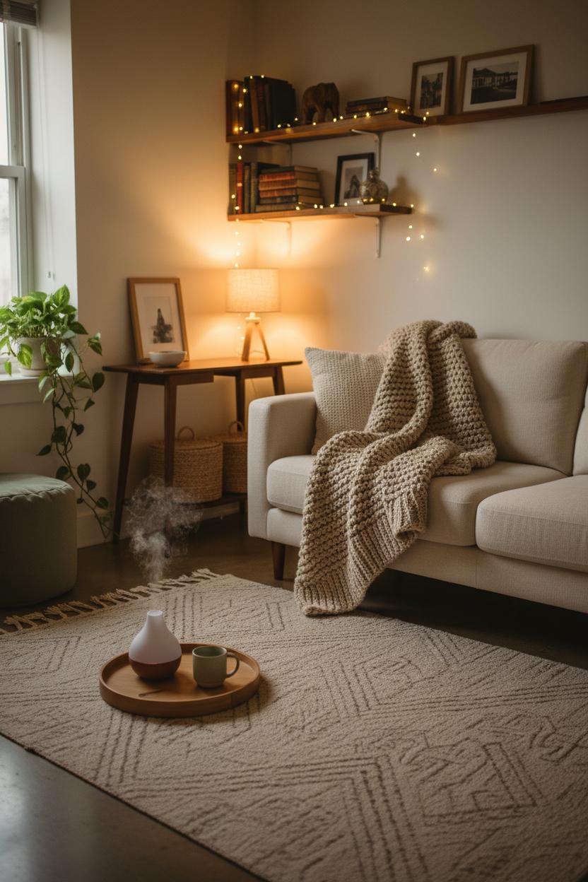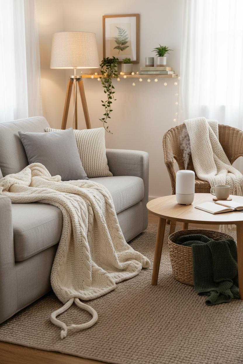 Then layer the senses. Tuck LED string lights along a shelf or headboard so your throw sits in a warm glow that flatters every texture. Add life with ceramic planters—small trailing greens or a petite fern will make the fibers of your blanket feel even cozier by contrast. Anchor the vibe with scent: an aromatherapy diffuser set to cedar, vanilla, or eucalyptus turns your corner into a tiny retreat after a long day. If you’re collecting cozy home ideas, build a ritual around that blanket—morning coffee, evening journaling, weekend naps—and let it be the tactile cue that shifts your pace. Rotate covers seasonally to keep things fresh: linen in spring, bouclé in fall, faux fur for the holidays. Your throw becomes the throughline of your homey apartment decor, pulling colors, light, and greenery together so even the smallest nook feels layered, lived-in, and loved.