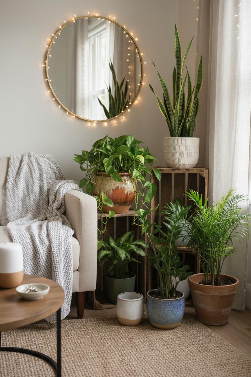 Style the corner like a tiny vignette: layer a neutral area rug to ground the space, add a basket or crate as a makeshift plant stand for varied heights, and drape a soft throw blanket over the nearby chair to invite lingering. Wind LED string lights around a mirror or along a curtain rod so leaves catch the glow at night, and suddenly your plants become part of the ambiance. Cluster two or three ceramic planters in different sizes for a collected look that reads homey apartment decor rather than “just moved in.” If you’re working beside the sofa, let a cascading vine trail toward the coffee table; if it’s the entry, pair a tall plant with a small dish for keys so beauty and utility share the same square foot.