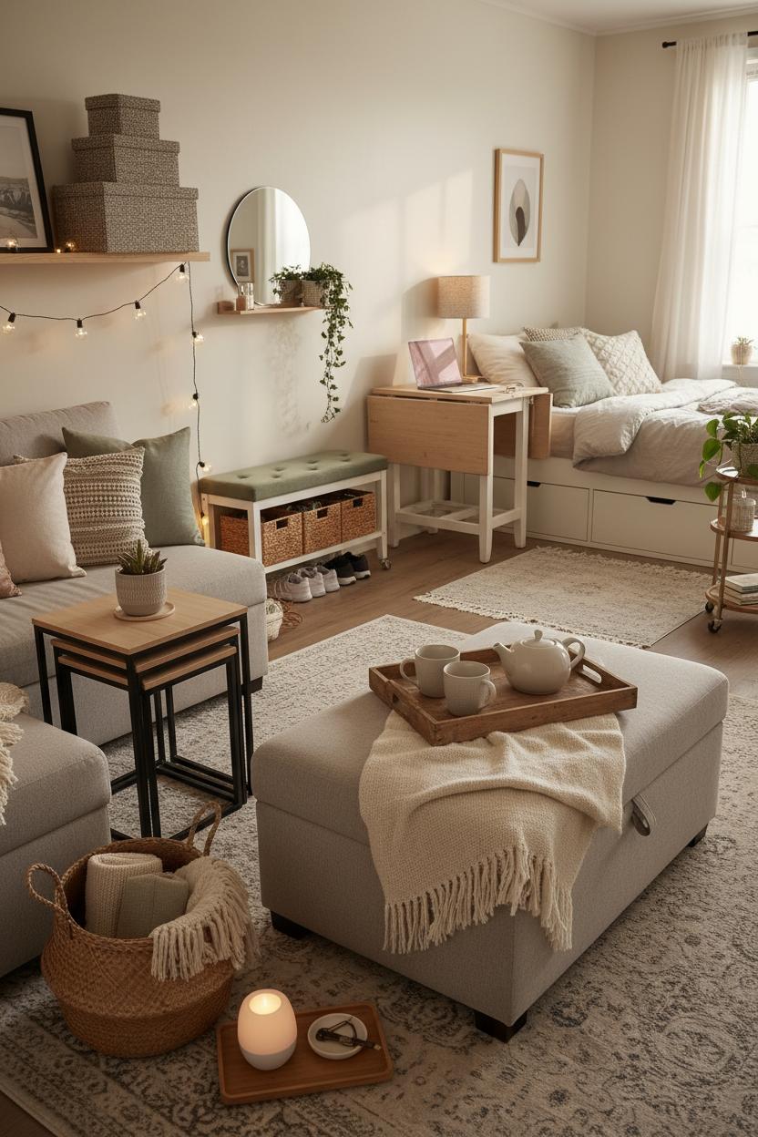 In a cozy small apartment, every piece has to earn its keep—and that’s where multi-use furniture becomes the secret sauce of homey apartment decor. Think storage ottoman that moonlights as a coffee table, topped with a tray for mugs and a soft throw blanket tucked inside for movie nights. A slim bench by the door hides shoes in baskets but also becomes extra seating when friends stop by. Nesting tables slide out for snacks, then tuck away; a bar cart doubles as a nightstand with a plant and books on top and charging cords corralled below. If you can swing it, a sofa with a storage chaise or a platform bed with drawers instantly swallows off-season clothes and spare linens, while a drop-leaf table transforms from desk to dinner in a blink. Keep the palette calm so your space feels open: a neutral area rug grounds the room, LED string lights add a gentle glow at dusk, and a few ceramic planters bring in greenery without visual clutter.