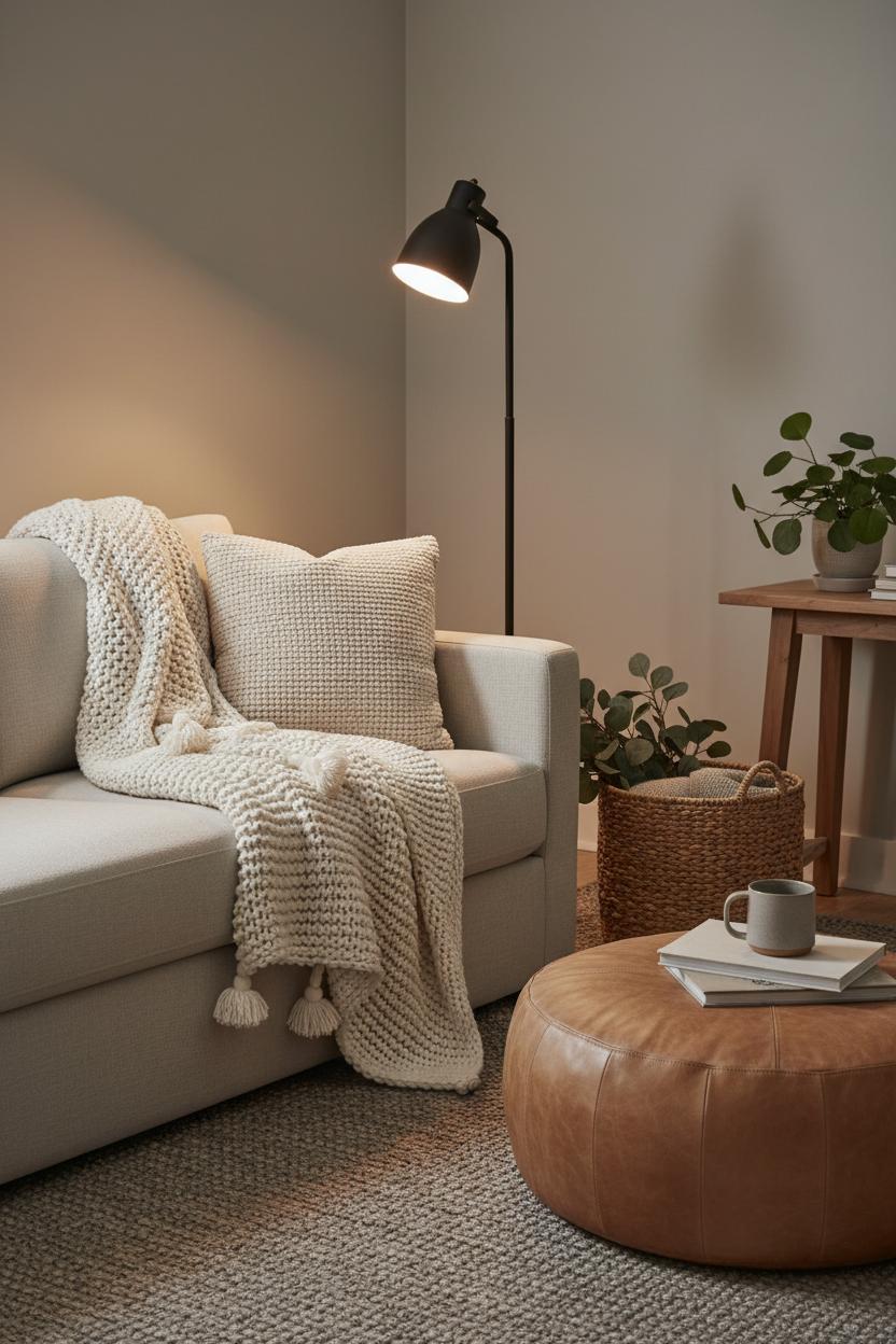 One of my favorite small living room ideas is to use texture to create zones when square footage is limited. Anchor the seating area with a neutral area rug, then echo its softness up on the sofa with your throw so the eye reads one cohesive, cozy nook. A dimmable floor lamp beside the couch keeps the glow low and flattering—dial it down in the evening and the whole room feels like a candlelit hug. Mix materials so everything doesn’t compete: linen or bouclé pillows, the knit throw, maybe a leather ottoman, and a bit of matte ceramic on the coffee table. Keep your color story tight and let the tactile layers do the talking; it’s the simplest way to elevate living room decor without adding visual clutter.