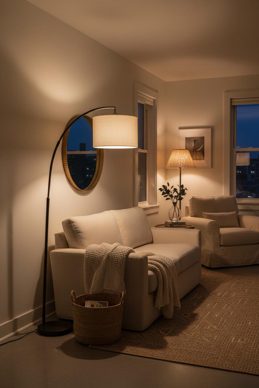 Placement is everything: nestle the lamp just behind the sofa to bounce light off the wall, or slide it beside a reading chair to create a cozy nook that invites long, slow evenings. For small living room ideas, aim the shade up to wash the ceiling and make the room feel taller, and set a mirror or light artwork opposite to double the glow. Style the base with a woven tray or rattan storage basket for hidden cords and texture; then finish the scene with a chunky knit throw tossed over the arm, a neutral area rug underfoot, and a small side table topped with faux eucalyptus stems for a hint of greenery that never wilts. These quiet layers speak the language of neutral home decor while still feeling personal and luxe.