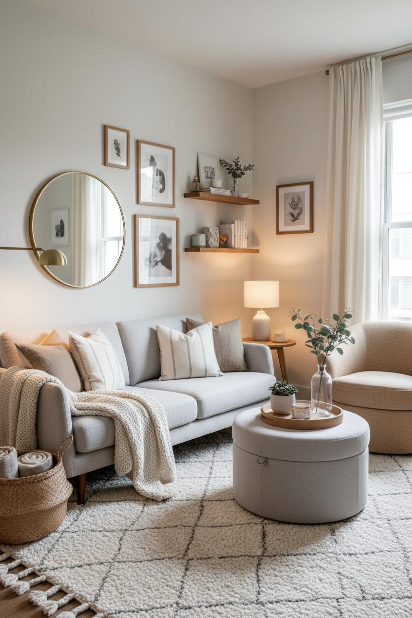 Think vertically and edit lovingly. Hang curtains high to draw the eye up, layer art salon-style to add personality without cluttering tabletops, and corral coffee-table essentials on a tray so you can clear the surface in a heartbeat. Choose furniture with airy legs to keep the room feeling light, and opt for round or oval pieces to ease traffic flow. A restrained palette—creamy whites, soft taupes, a whisper of charcoal—lets textures and glow take center stage, while a few natural materials create warmth you can feel. These small living room ideas prove that when you embrace scale and softness, style and comfort multiply—every inch working harder, and feeling cozier, than you ever thought possible.