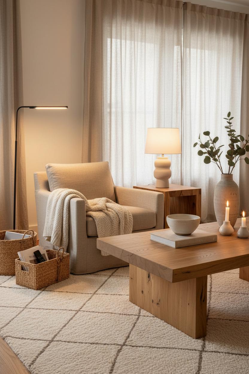 Style the details like you’re composing a quiet little still life. Slip a novel, headphones, and an extra throw into a rattan storage basket and slide it beside the chair; it adds texture and keeps clutter at bay. A simple ceramic vase with faux eucalyptus stems brings a hint of life and color that won’t mind low light. If you love rituals, stack two or three favorites on the side table, add a candle, and keep a coaster handy for tea. For evening reads, choose a warm 2700K bulb for the dimmable floor lamp—soft enough for a cozy living room, bright enough for crisp pages—and let the light pool onto your lap. Layering textures is key: knit meets linen meets woven rattan, all grounded by that neutral area rug underfoot. Even the smallest corner can feel intentional with this setup, and once your nook is in place, you’ll be surprised how often it draws you in—proof that the best living room decor isn’t just pretty, it’s a daily invitation to slow down.