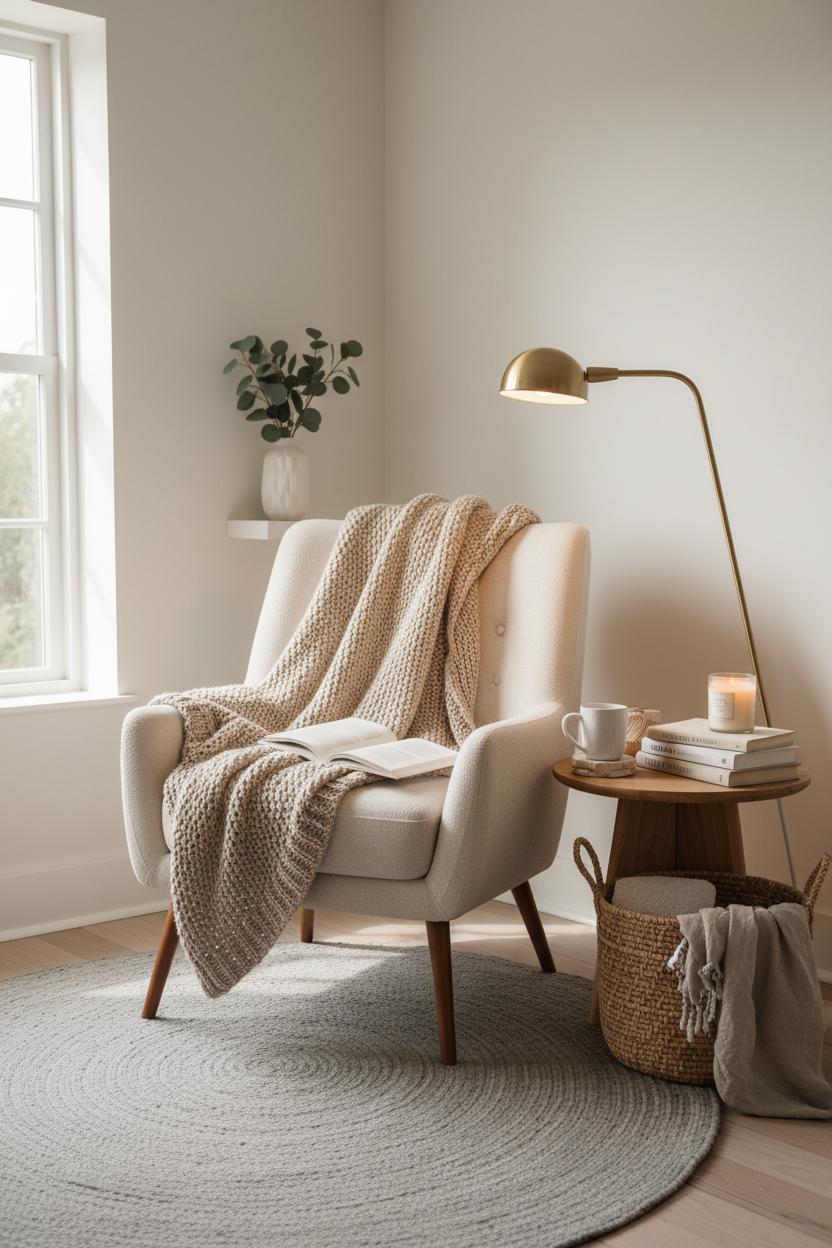 There’s nothing dreamier than claiming a quiet corner and turning it into your personal reading retreat. Start with a comfy chair you love and drape a chunky knit throw over the back so it’s always within reach; the texture instantly warms up your living room decor and invites you to linger for “just one more chapter.” Anchor the spot with a soft neutral area rug to define the zone, then tuck a dimmable floor lamp right at shoulder height so you can dial the glow from golden dusk to focused task light. If your space is tight, think small living room ideas: a chair with slim arms, a petite pedestal side table for your mug and book, and a slender lamp that arcs over your shoulder without hogging floor space. Keep the palette gentle to lean into that hygge home feeling—creamy whites, oatmeal, and soft gray layered with wood tones—so the whole nook blends seamlessly with your neutral home decor.