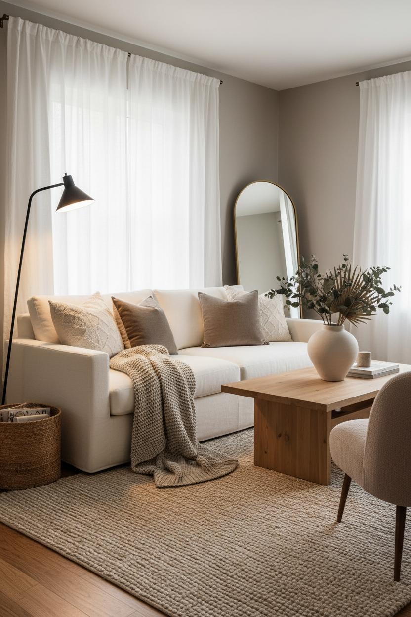 If you’re hunting for small living room ideas, keep the palette light and cohesive so the space reads open and airy. Choose furniture with visible legs to create breathing room, float a petite accent chair instead of crowding a bulky sectional, and let your curtains hang high and wide to stretch the walls. Mirrors bounce light, but so do layered neutrals, especially when your lighting is warm and adjustable. The best part? With a timeless neutral base, refreshing your living room decor is as simple as swapping a pillow cover, adding a seasonal bouquet, or trading in throws. It’s an easy, budget-friendly path to a room that feels grounded, welcoming, and irresistibly cozy every single day.