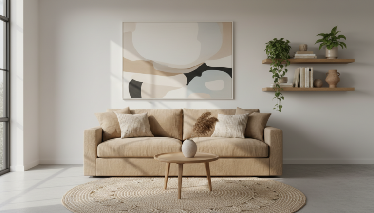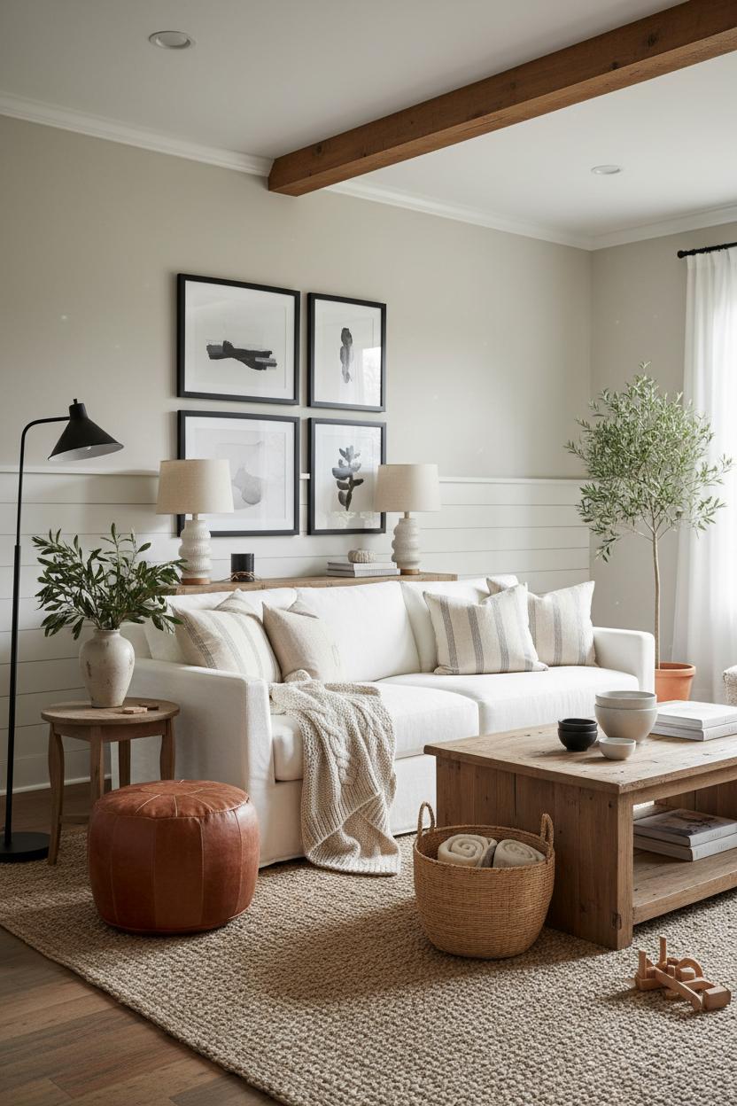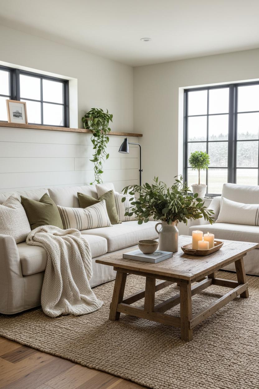 A cozy-meets-contemporary farmhouse living room starts with a soothing, layered foundation. Think neutral living room tones—creamy whites, warm oat, and soft greige—anchored by a plush slipcovered sofa that invites you to sink in. Underfoot, a jute area rug adds that nubby, beachy texture that instantly warms the space, while a reclaimed wood coffee table brings in timeworn character and a sense of story. To keep it feeling current, weave in streamlined silhouettes and a few bold accents: a black metal floor lamp, clean-lined frames, and simple ceramics balance the rustic notes with just the right amount of polish. That blend of old and new is the magic of modern farmhouse decor—cozy, but never cluttered; welcoming, but still refined.