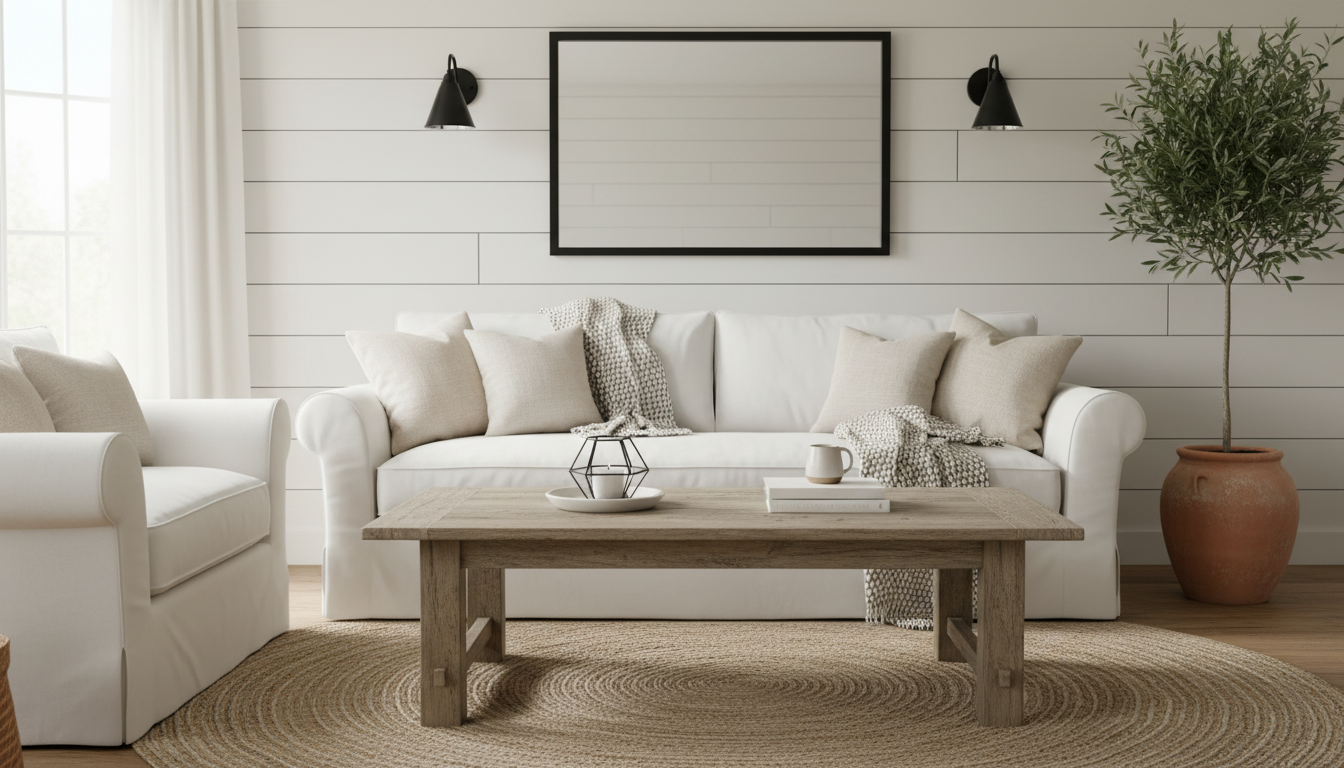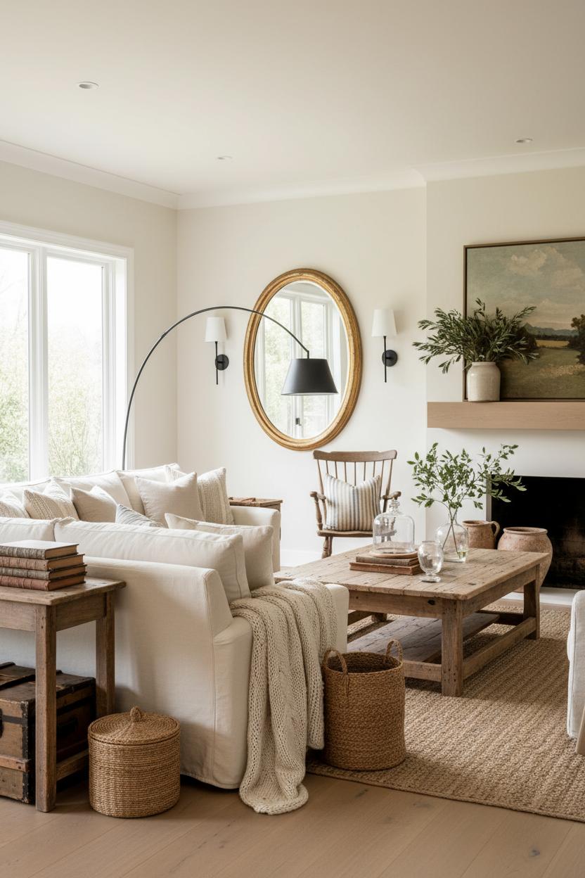 Blending old and new is the secret to a farmhouse living room that feels collected, welcoming, and never dated. Start with a calm, neutral living room palette—think creamy whites, weathered wood, and soft charcoal—and build layers that tell a story. A relaxed slipcovered sofa anchors the space with easy, family-friendly comfort; across from it, a reclaimed wood coffee table brings warmth and texture, its nicks and knots adding soul. Ground the seating with a chunky jute area rug so everything feels connected underfoot. Then sprinkle in modern notes: a sleek black metal floor lamp for a crisp silhouette and clean-lined frames that balance the patina of an antique mirror or a vintage painting. The mix is the magic—classic shapes paired with streamlined pieces keep modern farmhouse decor feeling fresh instead of fussy, while subtle contrasts (matte black against linen, raw wood beside glass) add quiet drama.