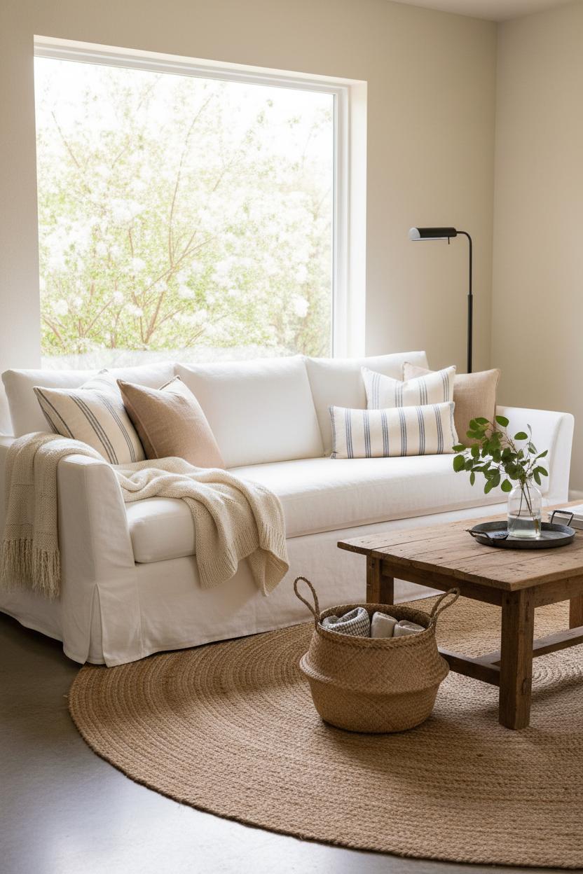 Don’t overcomplicate the layout: float the sofa to frame a view or anchor it against a wall, then tuck a woven basket beside it for throws and magazines. Keep a second slipcover on hand to swap out for deep cleaning or seasonal shifts—think crisp white for summer, warm flax for fall. Add a small tray to corral remotes and a vase of clipped greens for instant freshness, and you’ve got a modern farmhouse living room that’s as family-friendly as it is photogenic. When the foundation is right, every little detail feels easy.