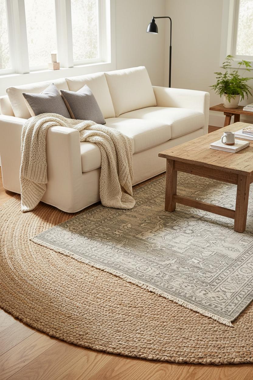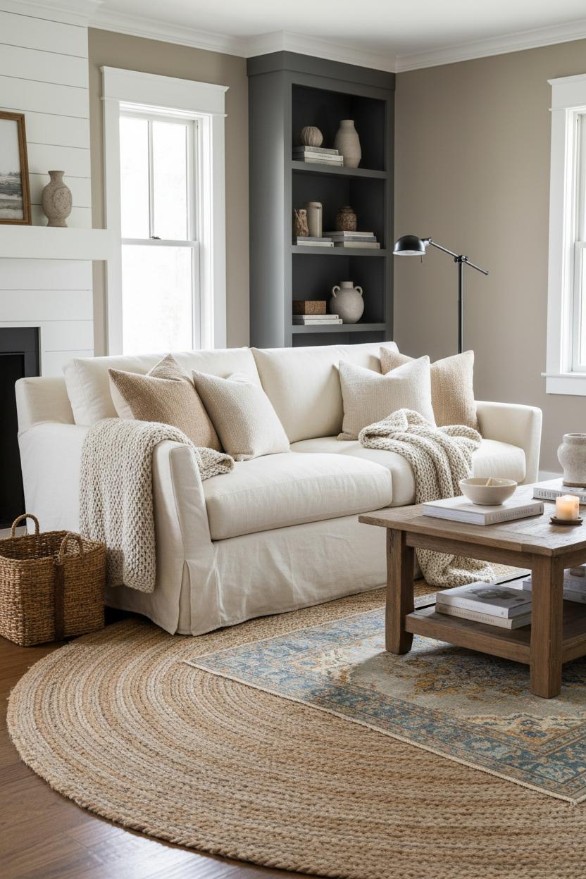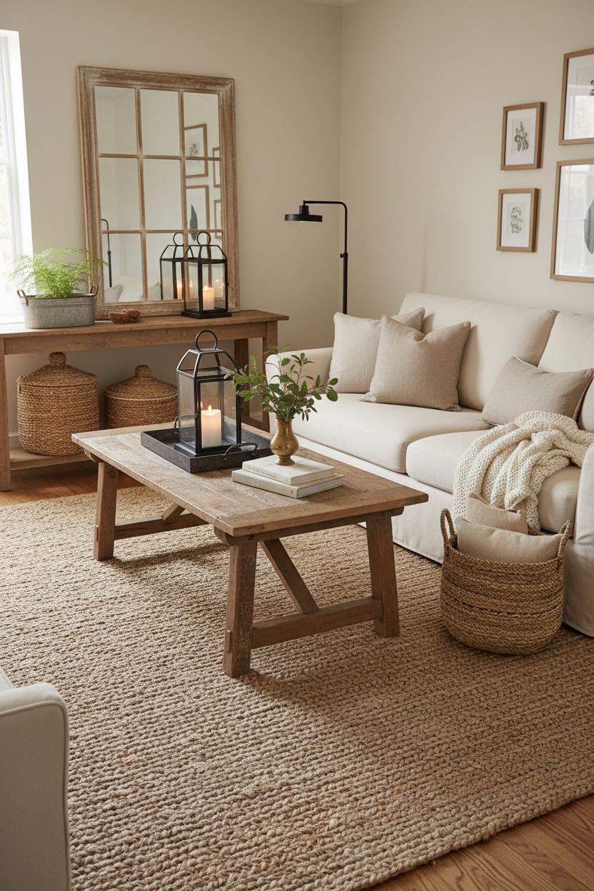 Start from the ground up and let a jute area rug set the tone for your neutral living room. The natural, nubby texture instantly warms a space, adding that sun-baked, sand-and-oat hue that feels right at home in a farmhouse living room. I love using a large flatweave jute as the base and then layering a smaller patterned wool or vintage-look rug on top to bring in a hint of character without overwhelming the palette. The contrast is everything: the earthy weave plays beautifully against the tailored lines of a slipcovered sofa and the timeworn grain of a reclaimed wood coffee table, while a black metal floor lamp adds a crisp, modern note. That mix is the heart of modern farmhouse decor—clean silhouettes, rustic home decor textures, and just enough patina to make the room feel storied and lived-in.