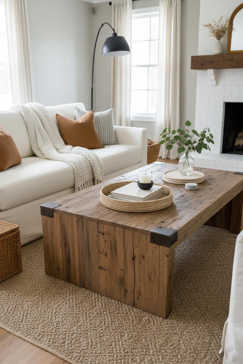When you’re thinking through cozy living room ideas, treat the surface of your reclaimed wood coffee table as the stage for all the tactile layers that make a room feel lived-in. A low, woven tray corrals everyday essentials while still showing off the wood; stack a couple of linen-bound books, tuck in a small vase of eucalyptus, and add a candle for a gentle evening glow. A chunky knit throw blanket draped across the sofa and a few nubby pillows bring in that touchable dimension that plays beautifully against the table’s sturdy lines. For contrast, a black metal floor lamp arcs overhead or stands sentry beside the seating, adding a crisp, modern note that keeps the rustic home decor from feeling too sweet. Consider scale: if your seating is generous, a rectangular or oversized square table feels luxurious; in tighter rooms, a round option keeps flow moving and softens edges. Don’t be afraid of mix-and-match—metal legs, breadboard tops, or salvaged beams all live happily with white ceramics, matte black accents, and woven baskets for hidden storage. A quick coat of clear wax or a set of stone coasters will protect the finish while preserving that beautiful, storied texture. In the end, the table becomes more than a surface—it’s the heart of conversation, cocoa mugs, puzzle nights, and everyday life, quietly stitching together old and new in the most effortless, modern farmhouse way.