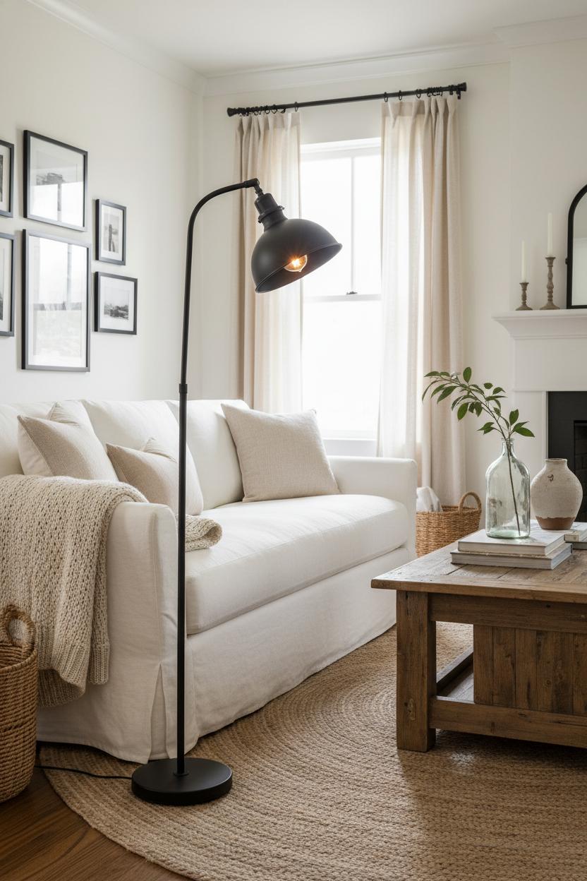 When choosing the right black metal floor lamp, think silhouette and scale. A slim, arched style tucks neatly into a corner reading nook, while a tripod base makes more of a statement near a gallery wall or fireplace. Go for a matte or oil-rubbed finish to keep things farmhouse-friendly, and pair it with a warm 2700K bulb (or even a soft Edison-style filament) for that candlelit vibe without the fuss. If you can, add a dimmer—instant mood-setting for movie nights and rainy days. Then let the lamp do the heavy lifting for your cozy living room ideas: tie the black tone into small accents like picture frames, curtain rods, or a metal tray, and offset it with natural textures—wicker baskets, stoneware, and chunky knit throw blankets draped casually over the arm. Keep your coffee table styling simple: a couple of pottery pieces, a leafy stem in a glass jar, and a stack of everyday books. The result is layered and livable, a seamless blend of modern farmhouse decor that feels elevated yet easy. With just one thoughtful piece—the black metal floor lamp—you get crisp contrast, flattering light, and a fresh focal point that makes the whole room click.