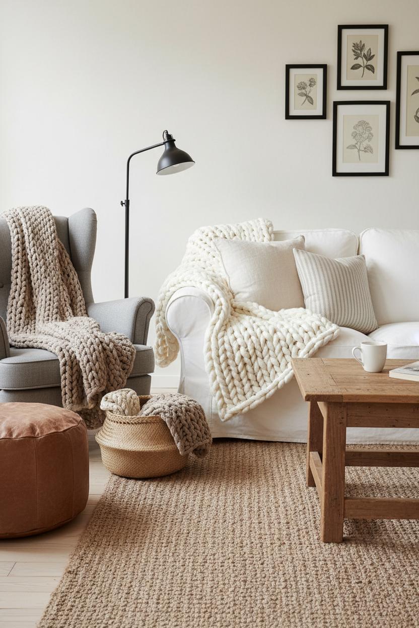 Style it like you mean it: fold the blanket lengthwise and let it waterfall over the side of the sofa, then tuck a corner under a pillow so it looks intentionally undone. Create a reading nook by placing a knit-draped chair next to a black metal floor lamp, letting that moody glow highlight the texture. Mix with linen pillows, a hint of leather, or subtle ticking stripes to ground the look in rustic home decor without feeling heavy. If your space leans light and airy, stick to tonal neutrals; for contrast, try charcoal or mushroom against pale walls and watch the texture pop. One of my favorite cozy living room ideas is to rotate blankets seasonally—lighter cotton or acrylic blends for spring and summer, plush wool for fall and winter—so the tactile comfort is always there. In a world of fast design fixes, a chunky knit throw blanket is the small, soulful layer that makes modern farmhouse decor feel personal, welcoming, and endlessly touchable.