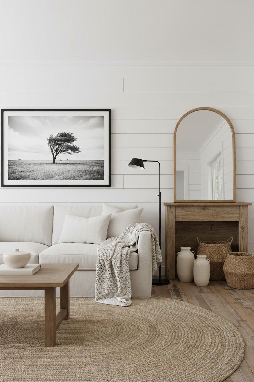 Mirrors are your best friend for doubling light and making even a cozy corner feel open. Choose a generous, round or arch-top mirror with a slim black or wood frame and lean it on a mantel, or hang it above a console to bounce the glow across the room. Flank it with simple sconces or let it shine solo with a cluster of ceramic vases and woven baskets below. In the world of cozy living room ideas, this trio—oversized art, a whisper of shiplap, and a statement mirror—works like a curated gallery, giving your modern farmhouse decor the layered story it deserves while letting textures, not trends, do the talking.