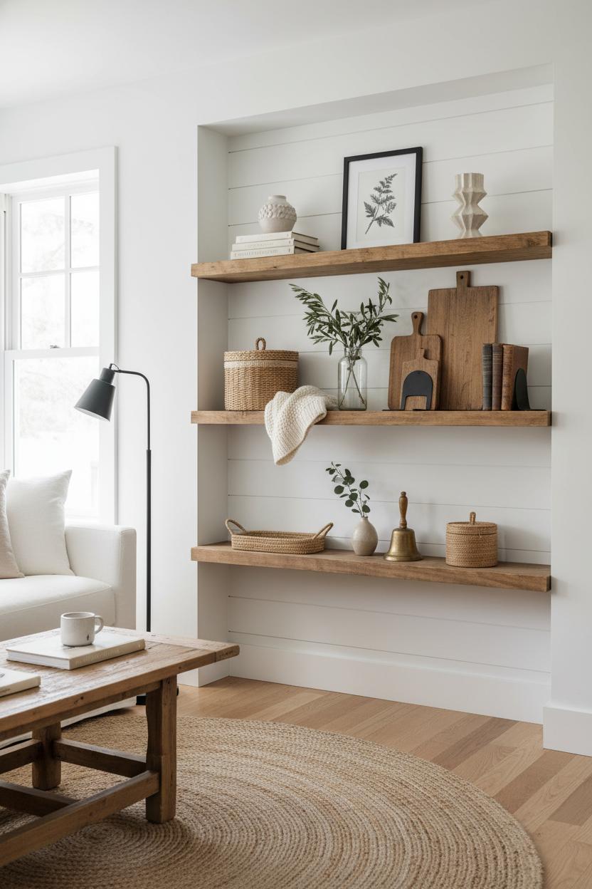 Let your shelves speak to the larger pieces in the room so everything feels connected. If you’ve got a slipcovered sofa nearby, tuck a chunky knit throw blanket in a woven basket on the lowest shelf to echo that cozy texture. A reclaimed wood coffee table? Mirror the warmth with a couple of reclaimed or vintage cutting boards leaned casually in the back, creating layered depth. The subtle sheen of a black metal floor lamp can be repeated with matte black frames or iron bookends to ground the arrangement and add just enough contrast. For even more touchable texture underfoot, let the nubby weave of a jute area rug inspire lidded baskets or seagrass trays on your shelves—perfect for hiding remotes and chargers without breaking the aesthetic. Rotate small seasonal items (a brass bell in winter, a hand-thrown bud vase in spring) to keep things fresh, and remember the rule of odds—groups of three tend to feel most natural. When in doubt, step back and remove one item; the best cozy living room ideas are often about restraint. With a few well-chosen pieces and plenty of white space, open shelves become a quiet showcase for modern farmhouse decor—warm, lived-in, and beautifully uncluttered.