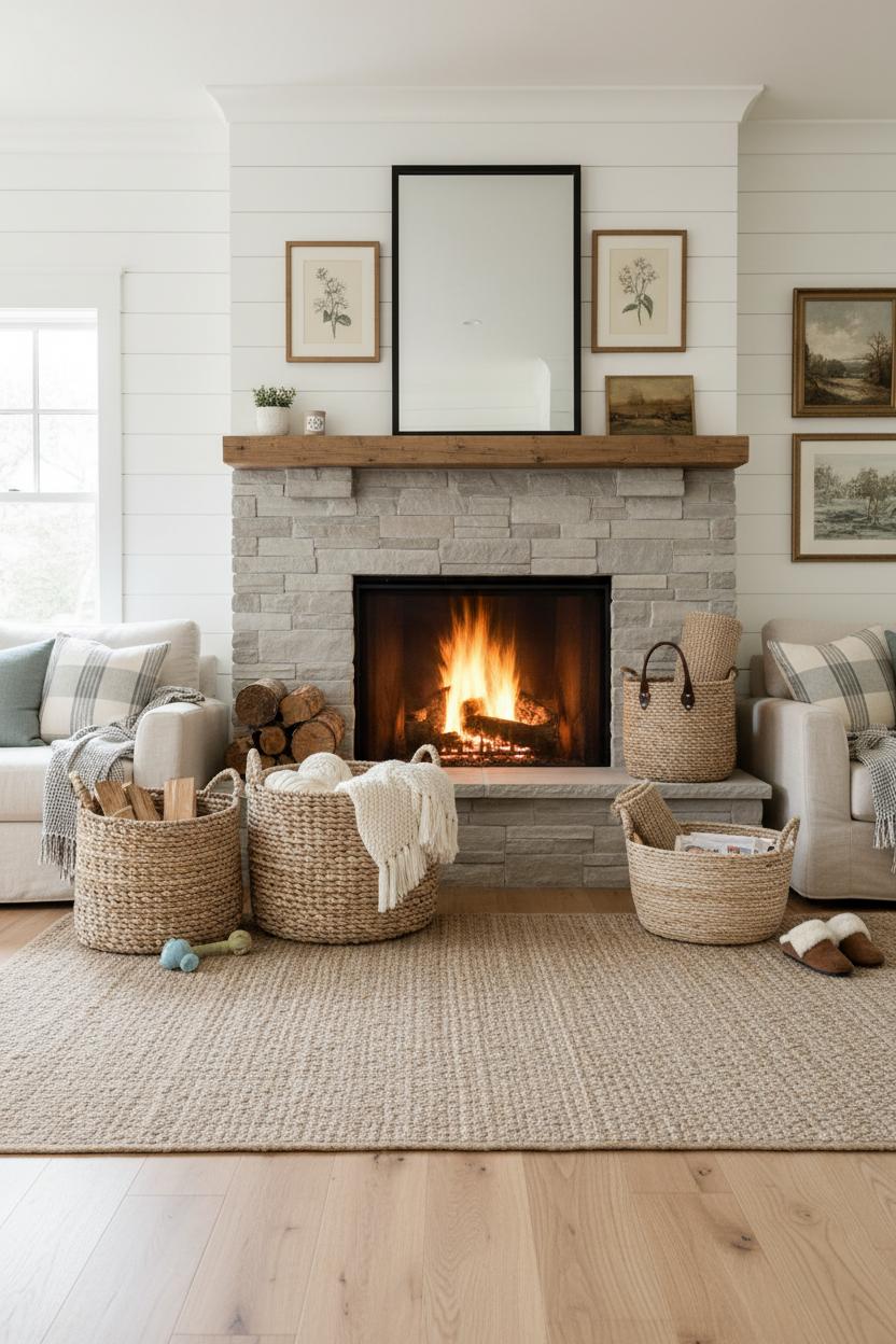 A few smart details keep form and function in harmony. Choose baskets with leather handles for a subtle hit of contrast, slip felt pads underneath to protect floors, and keep them a safe distance from open flame. Tuck a low, wide basket at the end of the hearth for slippers or magazines, and let a taller one double as a side table with a tray perched on top—instant multitasker. The result is a hearth that feels curated yet lived-in, full of texture and warmth, and totally pin-worthy. In a room layered with shiplap, soft textiles, and thoughtful farmhouse decor, those woven storage baskets become the quiet heroes that make everyday life look effortlessly styled.