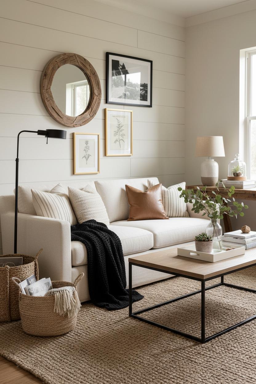 The magic of a cozy modern farmhouse living room is all in the mix—think clean silhouettes softened by timeworn texture. Start with a streamlined sofa or tailored armchair and ground it with a chunky jute rug underfoot for that earthy, rustic home warmth. Layer in linen throw pillows and a nubby knit throw so everything feels touchable, then bring in contrast with a black metal floor lamp or a slim-legged coffee table. If you’re craving character on the walls, add subtle shiplap as an accent, or try removable shiplap wallpaper for an instant architectural moment without the commitment. Keep your palette gentle—creamy whites, warm taupes, and a hint of inky charcoal—so the space reads calm and cohesive. Woven storage baskets tucked beside the sofa corral blankets and magazines while adding natural texture, and a reclaimed wood console table pairs beautifully with modern lines for a look that whispers, not shouts. These simple living room ideas let farmhouse decor feel fresh instead of theme-y.