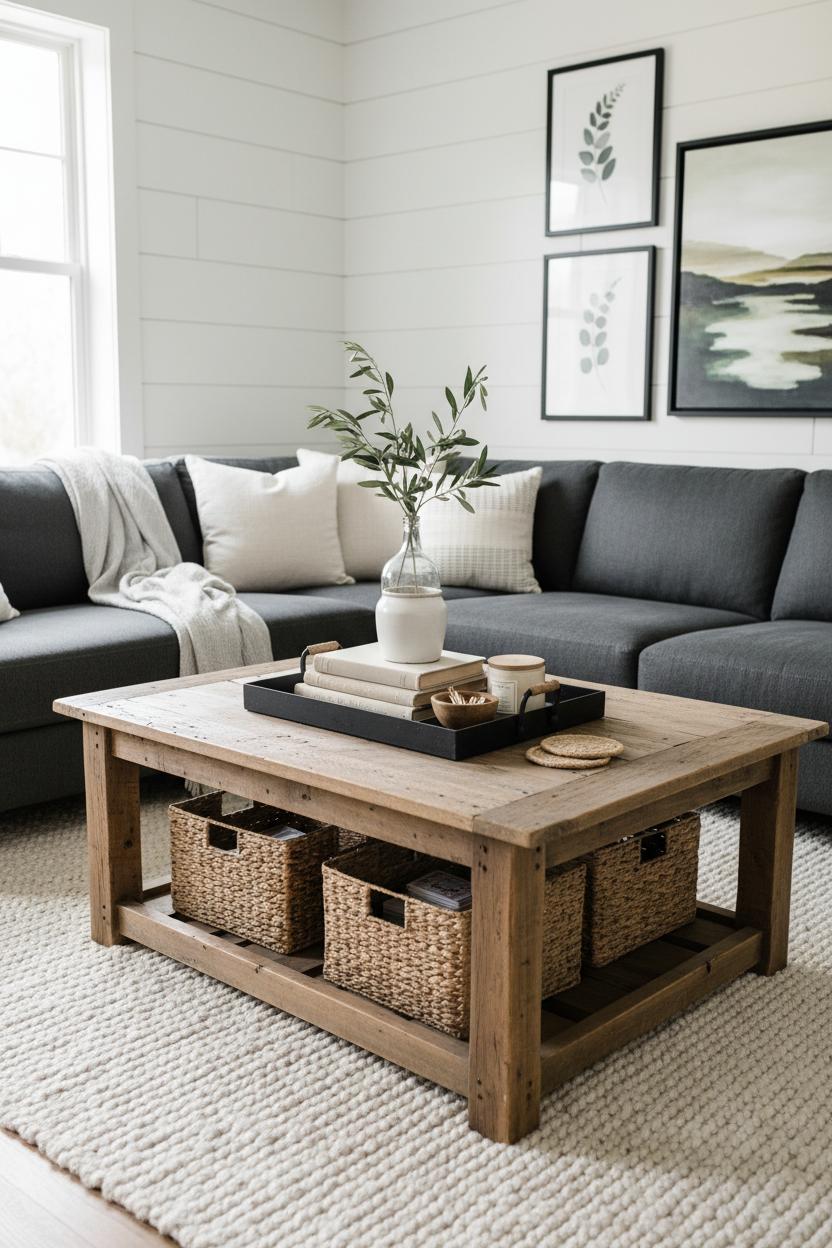 Think in threes and play with height: a low stack of books, a medium element like a lidded jar, and a taller piece such as a slender glass bottle with branches. Mix materials—ceramic, wood, glass, and a hint of metal—so your table reads curated, not cluttered. Keep it livable: a pretty set of coasters, a small bowl for matches, and a pair of woven storage baskets tucked beneath for remotes or card games. Soften the whole scene with linen throw pillows on the sofa and a lightweight throw draped within reach; that blend of clean lines and touchable layers is what makes modern farmhouse magic. For seasonal living room ideas, swap the greens for dried wheat in fall, sea grass in summer, and citrus branches in winter. Stay within an earthy palette—creamy whites, inky charcoal, and weathered wood tones—so the eye can rest. When the tray’s styled, stand back and edit until there’s generous breathing room; negative space is your secret styling tool. With a few thoughtful layers and textures, your coffee table becomes a welcoming pause point that quietly ties your rustic home together.