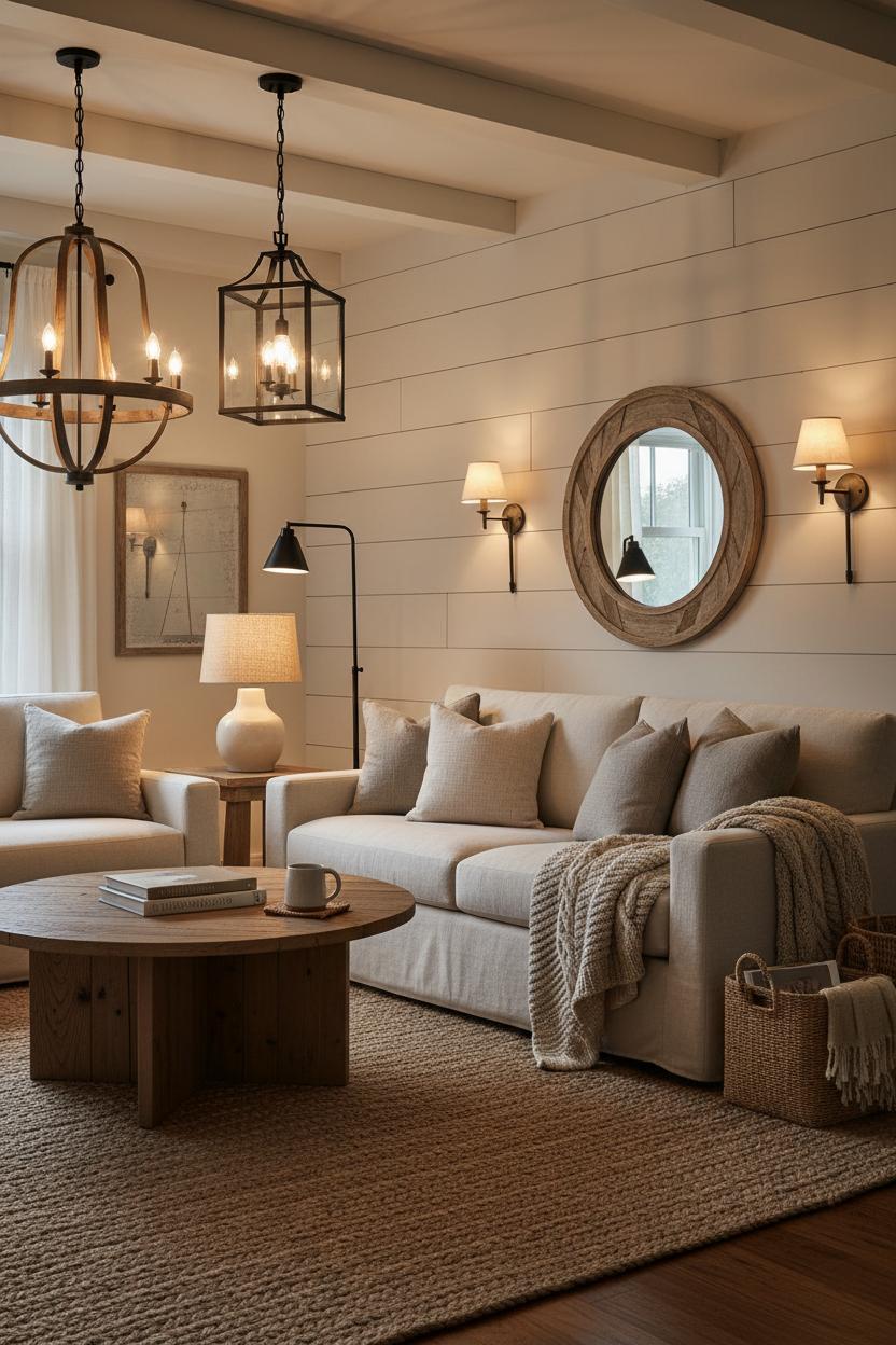 When the sun dips and the room starts to glow, layered lighting is where that cozy modern farmhouse magic really happens. Think of a simple lantern-style pendant anchoring the seating area, casting a warm pool over the coffee table while still feeling airy and unfussy. If your ceiling is the star, a wood-and-metal chandelier makes a gentle statement that leans modern farmhouse without feeling heavy. Sconces are the secret sauce—tuck them on either side of a vintage mirror or a piece of farmhouse wall decor for that soft, flattering halo you only get from light at eye level. Against real shiplap, their shadows add texture; on a budget or in a rental, peel-and-stick shiplap wallpaper gives you the same charming backdrop with zero commitment.