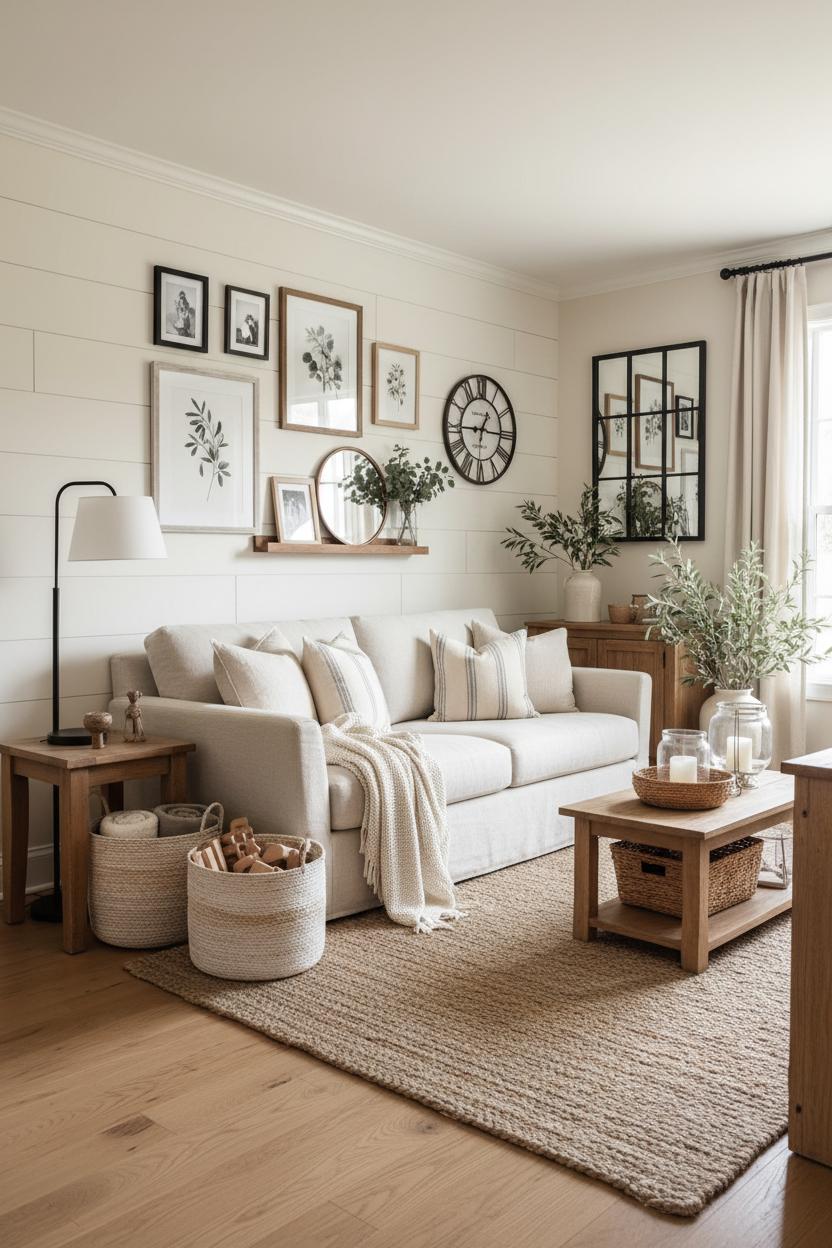 Round it out with easy, budget-friendly layering: swap shiny knobs for antique brass or wrought iron hardware, tuck remotes into a lidded basket on the coffee table, and drape a nubby throw over the arm of the sofa. A pair of glass hurricanes with unscented pillar candles adds glow, while a ceramic crock filled with olive or eucalyptus stems brings life to the corner. These living room ideas prove that the modern farmhouse look is less about pricey pieces and more about thoughtful textures, soft light, and collected accents—and with a few smart finds like shiplap wallpaper, a jute rug, woven storage baskets, and linen throw pillows, you can get the look for less and love it longer.