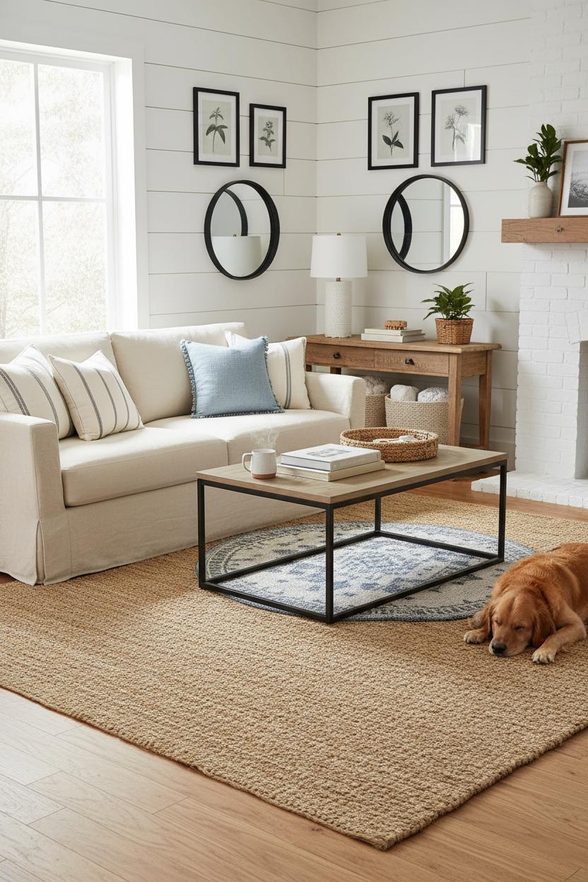 For easy living room ideas, treat the jute rug as your base layer and build upward with texture-on-texture moments. Toss in linen throw pillows for a breezy contrast, and add woven storage baskets under a console to corral blankets and remotes while echoing that tactile weave. If your walls are plain, a touch of shiplap—real or renter-friendly shiplap wallpaper—adds subtle rhythm behind the sofa and pairs perfectly with natural fibers. A gallery of farmhouse wall decor, like vintage-inspired botanicals or a simple black-frame mirror, brings vertical interest without stealing the show. You can even float a smaller patterned rug over the jute for a pop of color and a cushier feel under the coffee table; the neutral base lets you switch patterns seasonally without redoing the whole room.