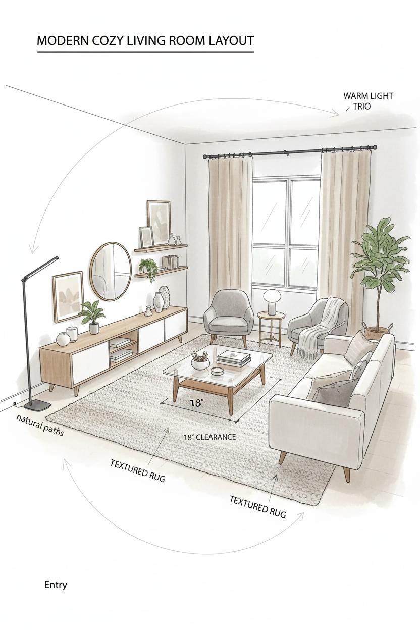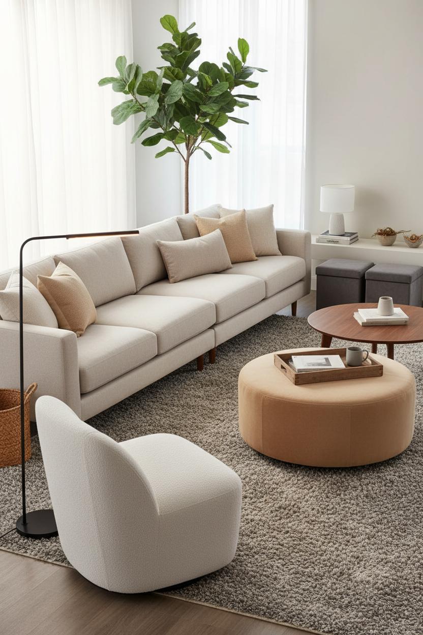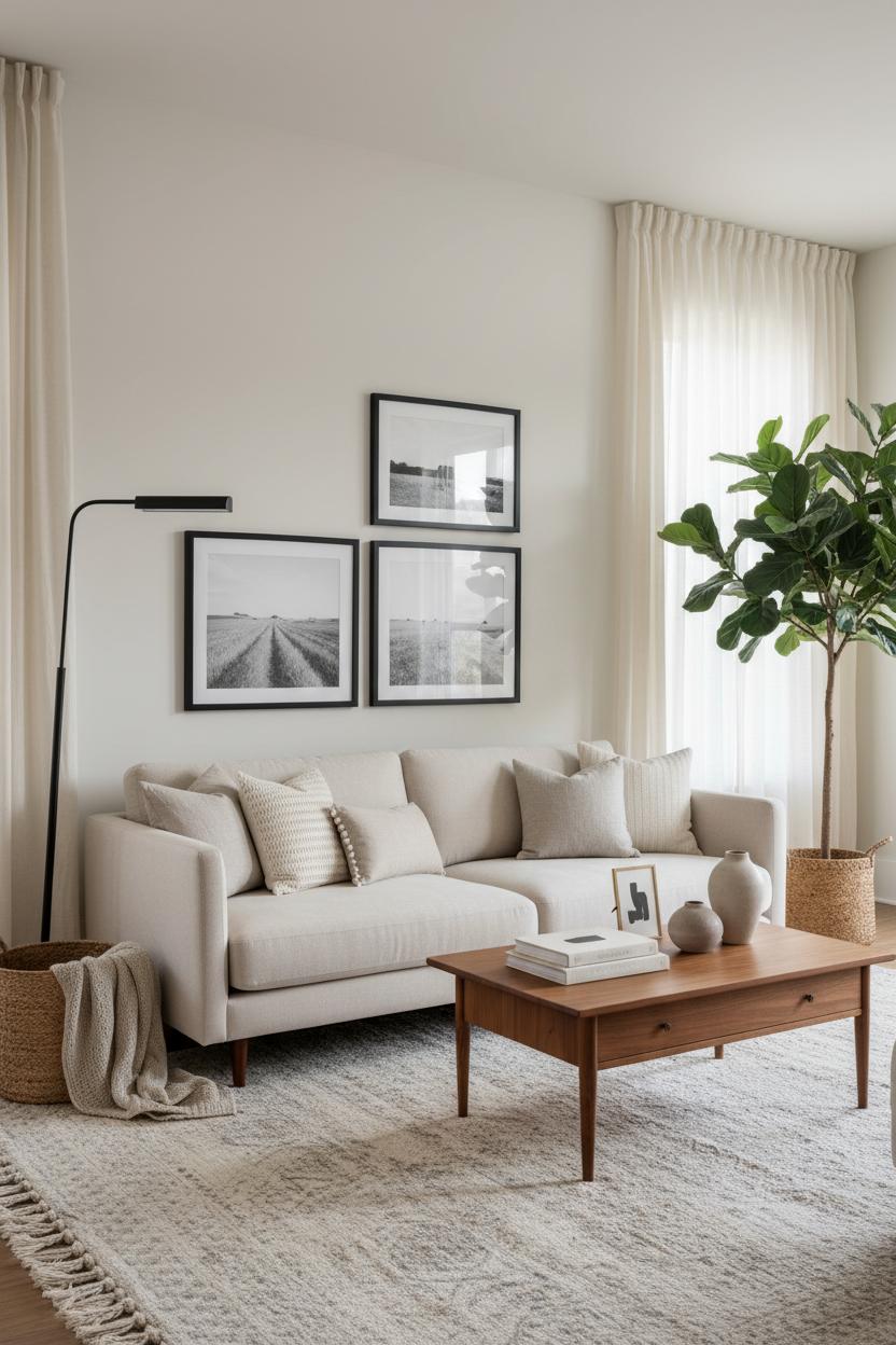 Finally, add life and height. A faux fiddle leaf fig in a woven basket fills an awkward corner without maintenance and balances the room’s verticals. Art hung at eye level, a stack of books on your mid-century coffee table, and a ceramic bowl of matches or coasters offer personality without clutter. If the space is tight, go for armless accent chairs you can swivel, mirrors to bounce light, and curtain rods mounted high to stretch the room. With function mapped, flow protected, and warmth layered in, your living room feels edited yet inviting—the sweet spot where modern and cozy peacefully coexist.