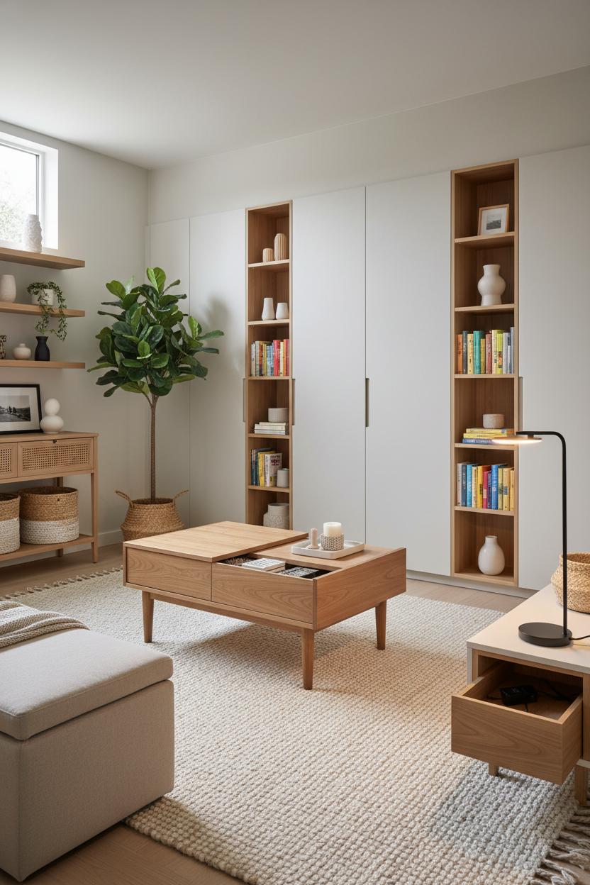 If you’re hunting for small living room ideas, go vertical and multipurpose. Floating shelves above the sofa, a window seat with hidden compartments, or a narrow bookcase with baskets instantly create homes for things that usually spill onto surfaces. Trade a bulky table lamp for an LED floor lamp to free up side-table real estate, and use a simple tray on the coffee table to gather coasters and candles so you can whisk the whole setup away in one go. A petite media cabinet with built-in cord management keeps wires out of sight; dedicate a drawer to a power strip so devices charge behind closed doors. Style smart by repeating textures—rattan, linen, wood—so bins and boxes read as decor, not storage. Then add life with a faux fiddle leaf fig in a woven basket to fill an awkward corner without the shed of real leaves. The result is a modern living room that feels warm, edited, and easy to live in—proof that clever concealment can be just as beautiful as what’s on display.