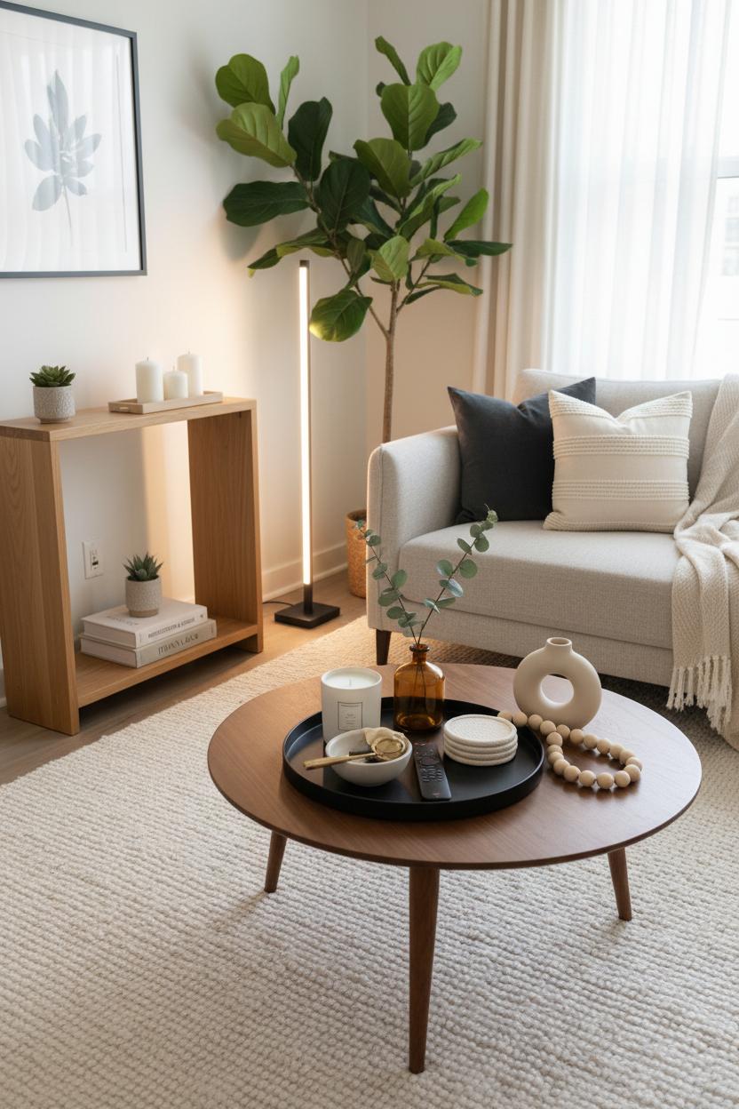The last layer is where your personality shows up, and trays, candles, and books are the easiest way to make a modern living room feel lived-in and loved. Start with a simple tray to corral the little things that otherwise float around; on a mid-century coffee table, a round wood or matte metal tray keeps a candle, wick trimmer, a petite bud vase, and a low bowl for remotes feeling intentional instead of messy. Add a stack of pretty coasters and a strand of wooden beads or a sculptural object for soft shape. If you’re playing with small living room ideas, try a skinny rectangular tray on the console or ottoman and keep the palette tight—think warm woods and ceramics that echo your neutral home decor. A few design or travel books in tones that complement your neutral throw pillows work double duty as risers; set the candle on top for height or lift a tiny plant so it doesn’t disappear. Books also tell your story—choose titles you actually flip through, and consider removing busy dust jackets so the linen spines calm the vignette.